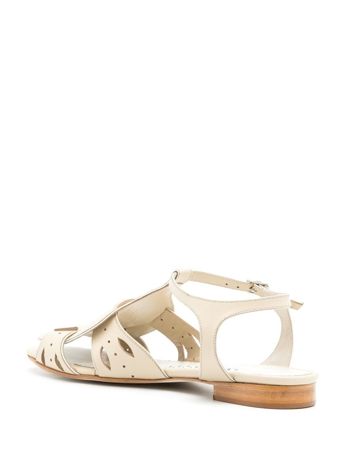 Открытый носок, вырезные детали, ремешок на щиколотке с пряжкой, стелька с логотипом и плоская кожаная подошва.