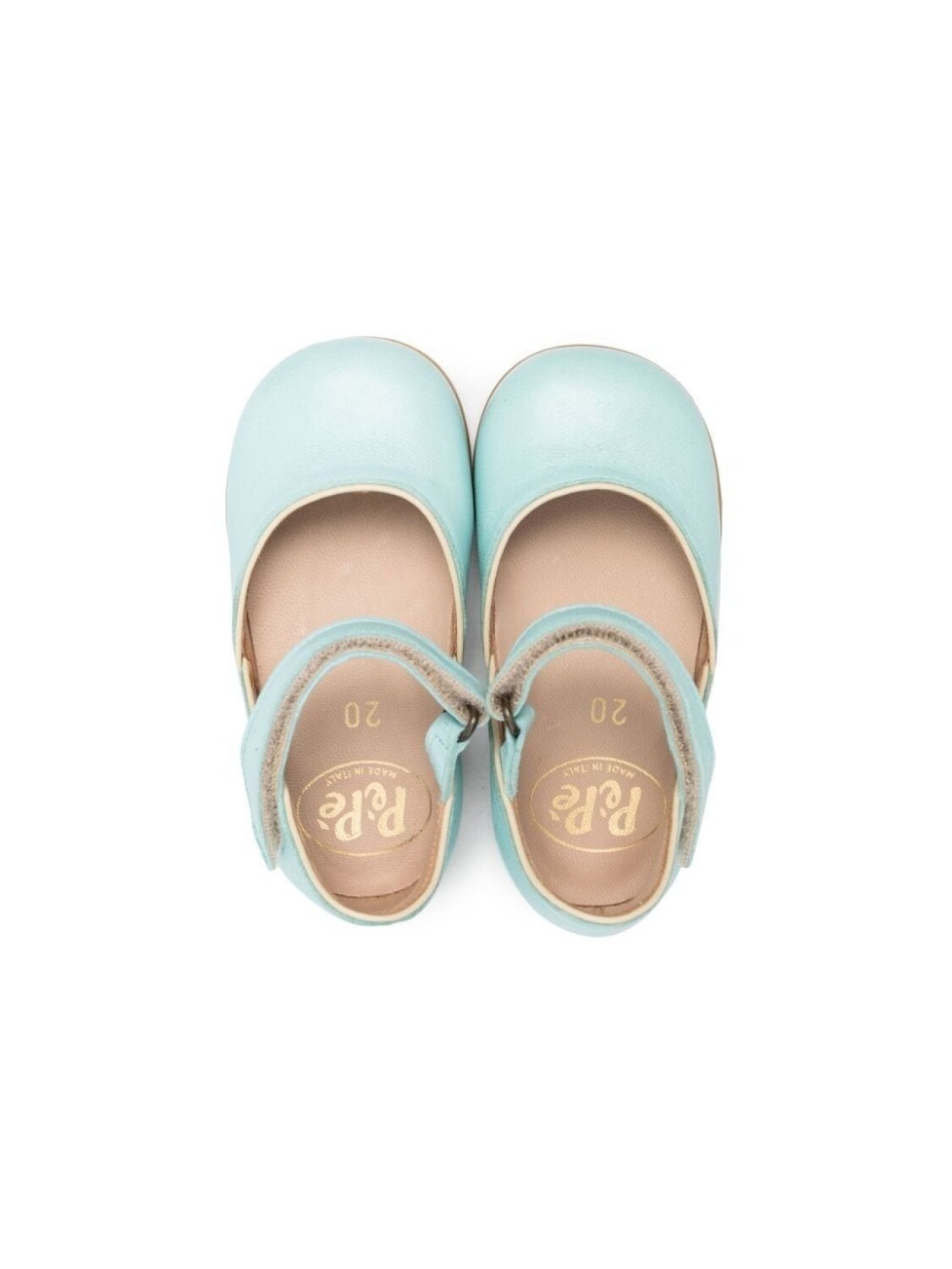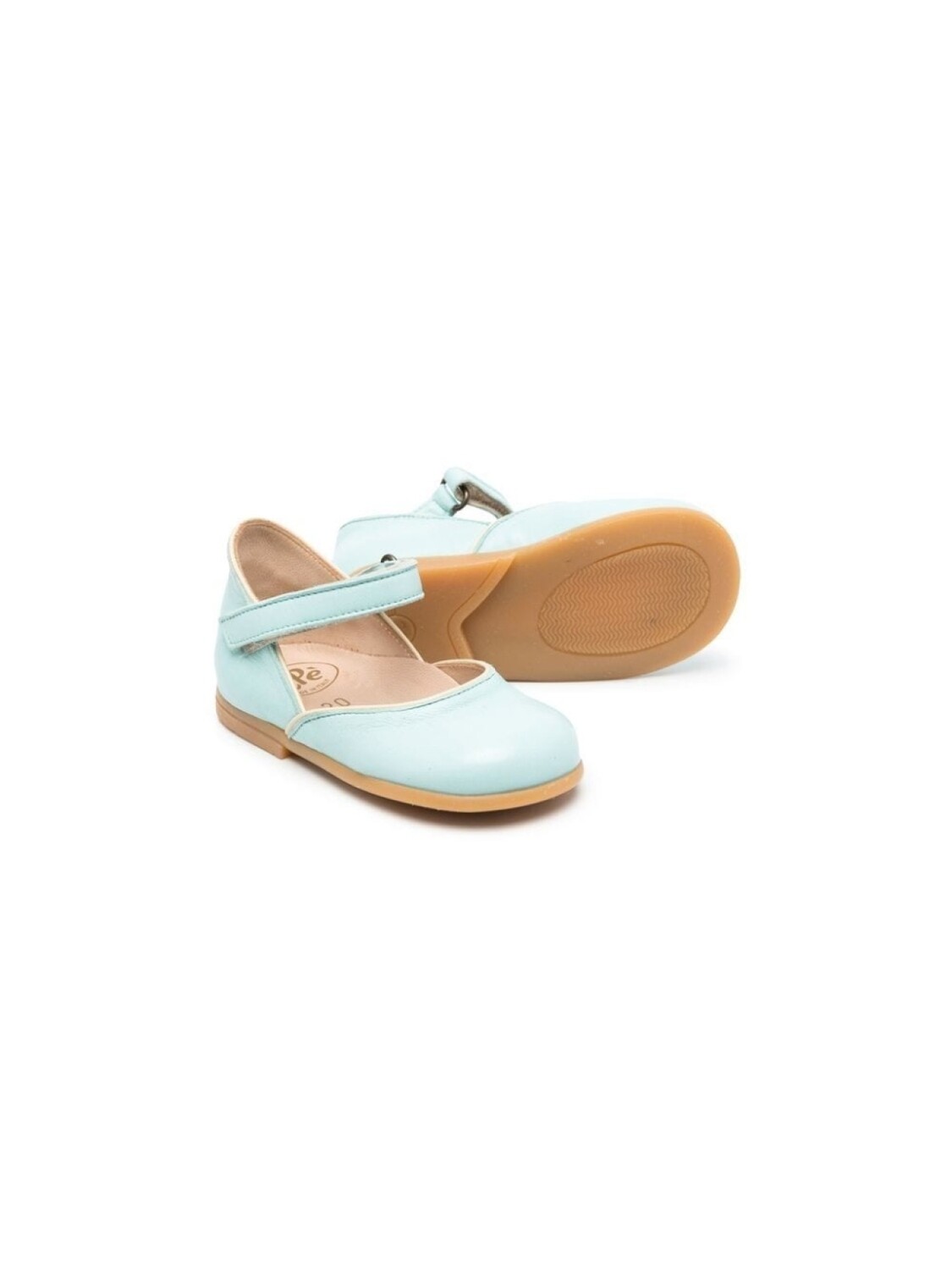 Сине-зеленый, телячья кожа, козья кожа, закругленный носок, застежка на липучке и плоская резиновая подошва.