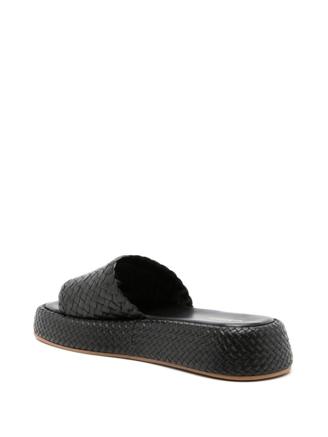 Черный, кожа, стелька с логотипом, переплетенный дизайн, открытый носок и плоская подошва.