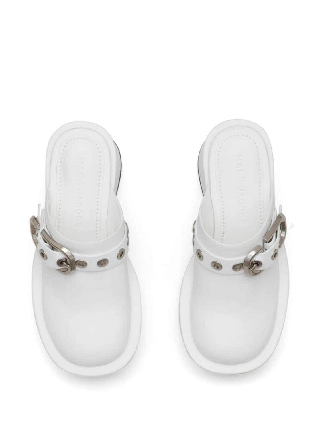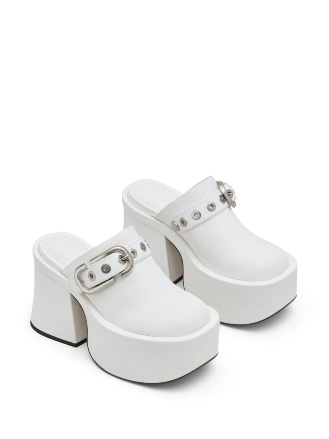 Белый, кожа ChromeFree®, застежка на серебристой пряжке, закругленный носок, высокий блочный каблук, стелька с логотипом и модель без застежки.