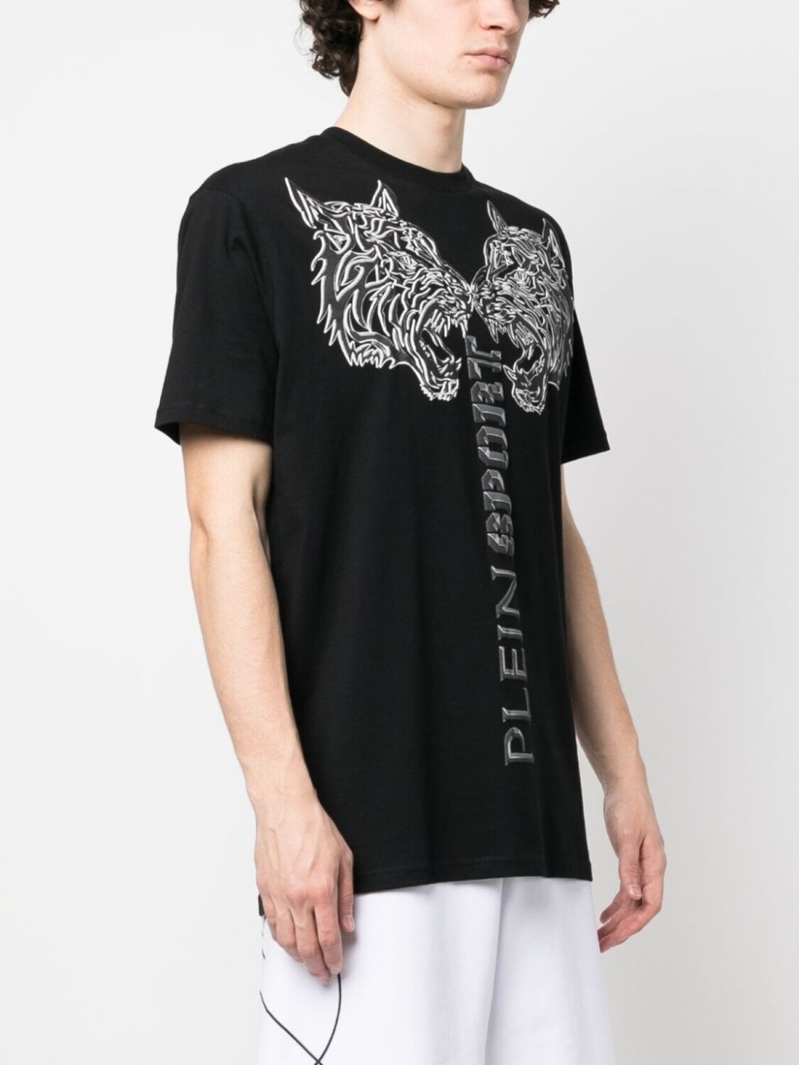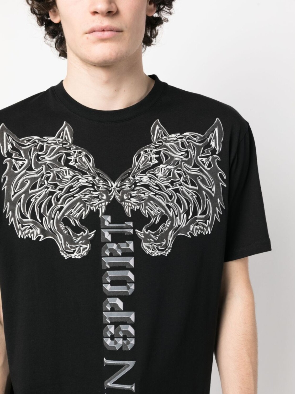 Черный, принт с логотипом сзади, декор Tiger Head, круглый вырез, короткие рукава и прямой подол.