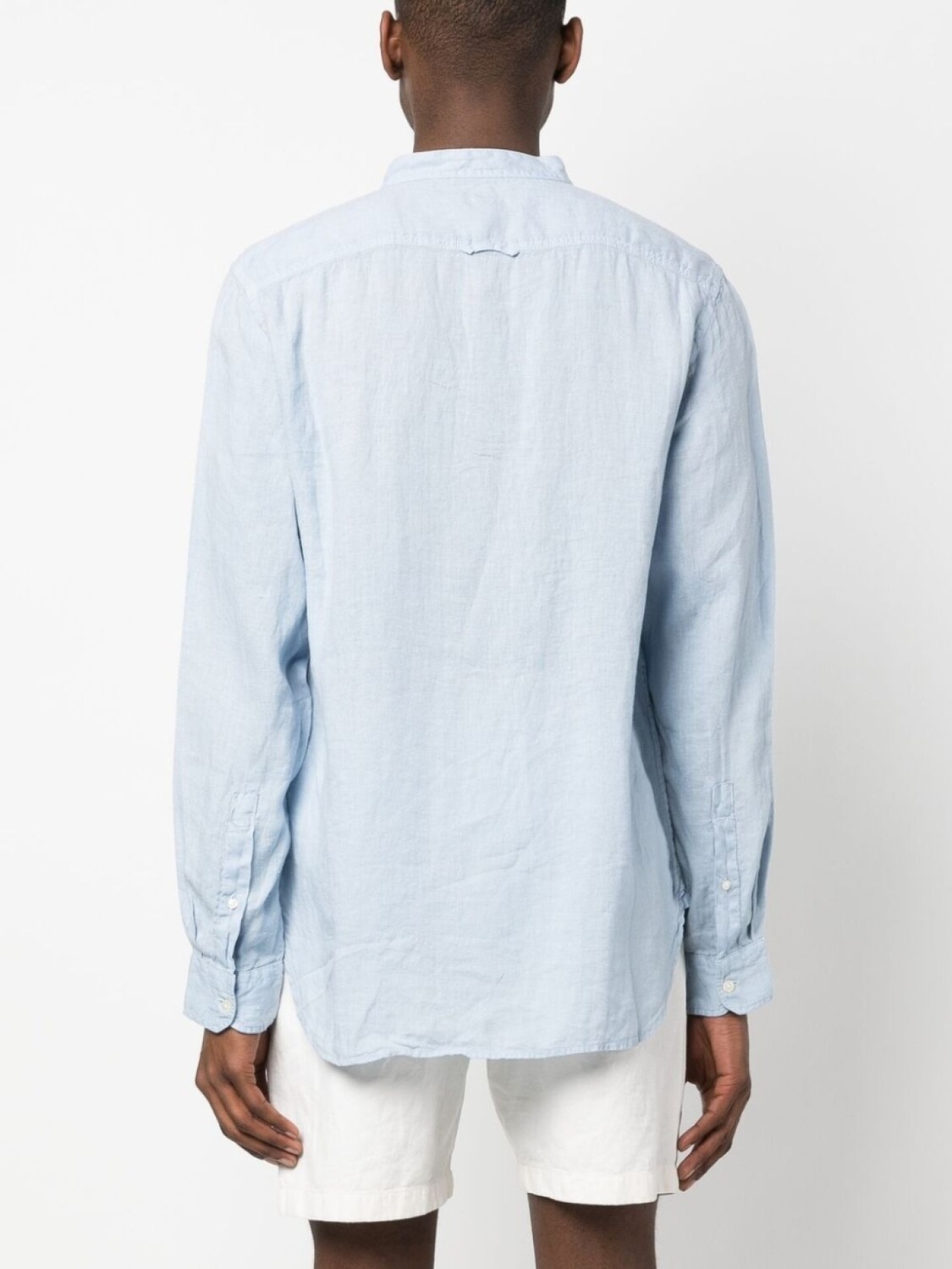 Пудрово-голубой, лен, воротник-стойка, застежка на пуговицах спереди, нагрудный накладной карман, длинные рукава, манжеты на пуговицах и прямой подол. Ответственный выбор: Этот товар как минимум на 50% состоит из материалов, которые признаны более безопасными для окружающей среды или сертифицированы независимыми организациями.