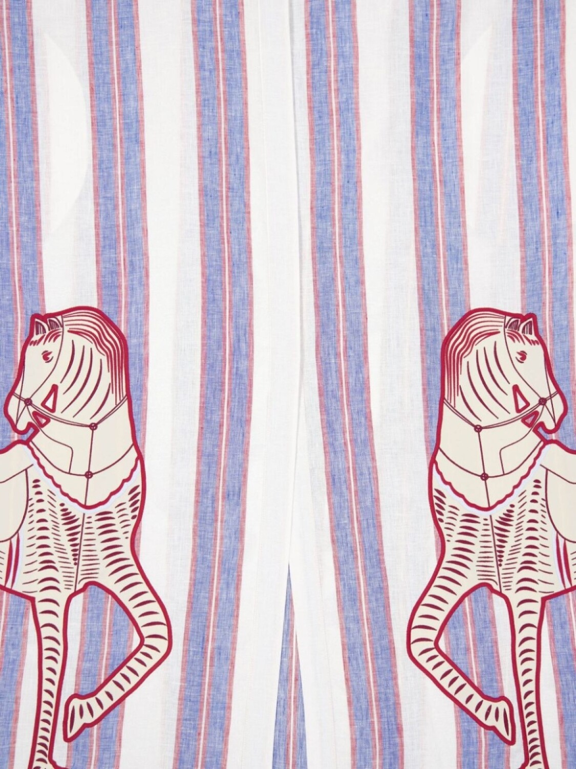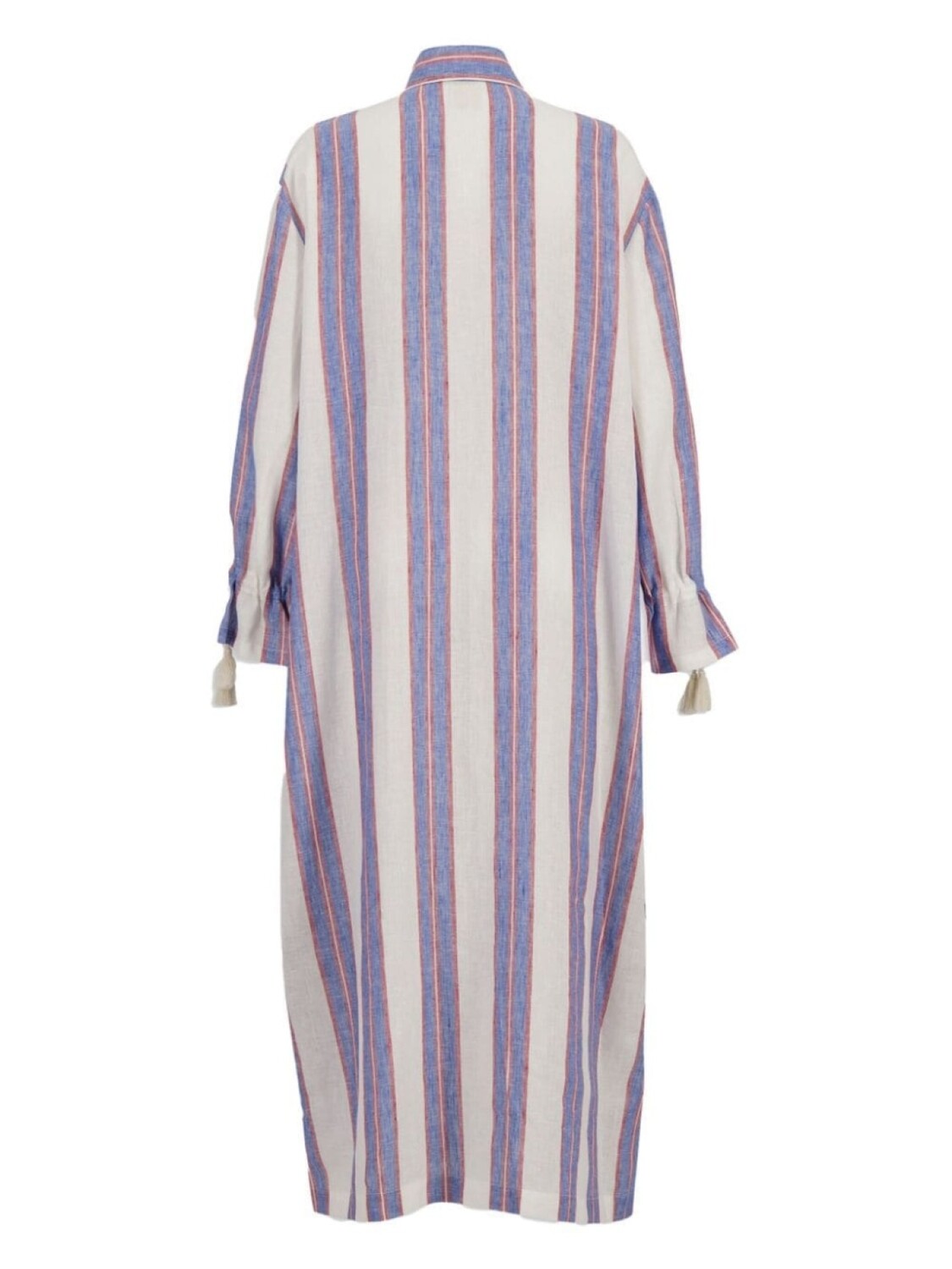 Синий/красный/белый, лен, узор в вертикальную полоску, вышивка, декоративные кисточки, классический воротник, потайная пуговичная застежка спереди, приспущенные плечи, длинные рукава, манжеты с кулиской, прямой подол, длина миди, Этот товар как минимум на 50% состоит из материалов, которые признаны более безопасными для окружающей среды, и/или произведены с использованием методов, которые помогают сократить потребление воды и химических веществ., Узнать больше о том, какие товары получают отметку «Ответственный выбор», можно здесь.