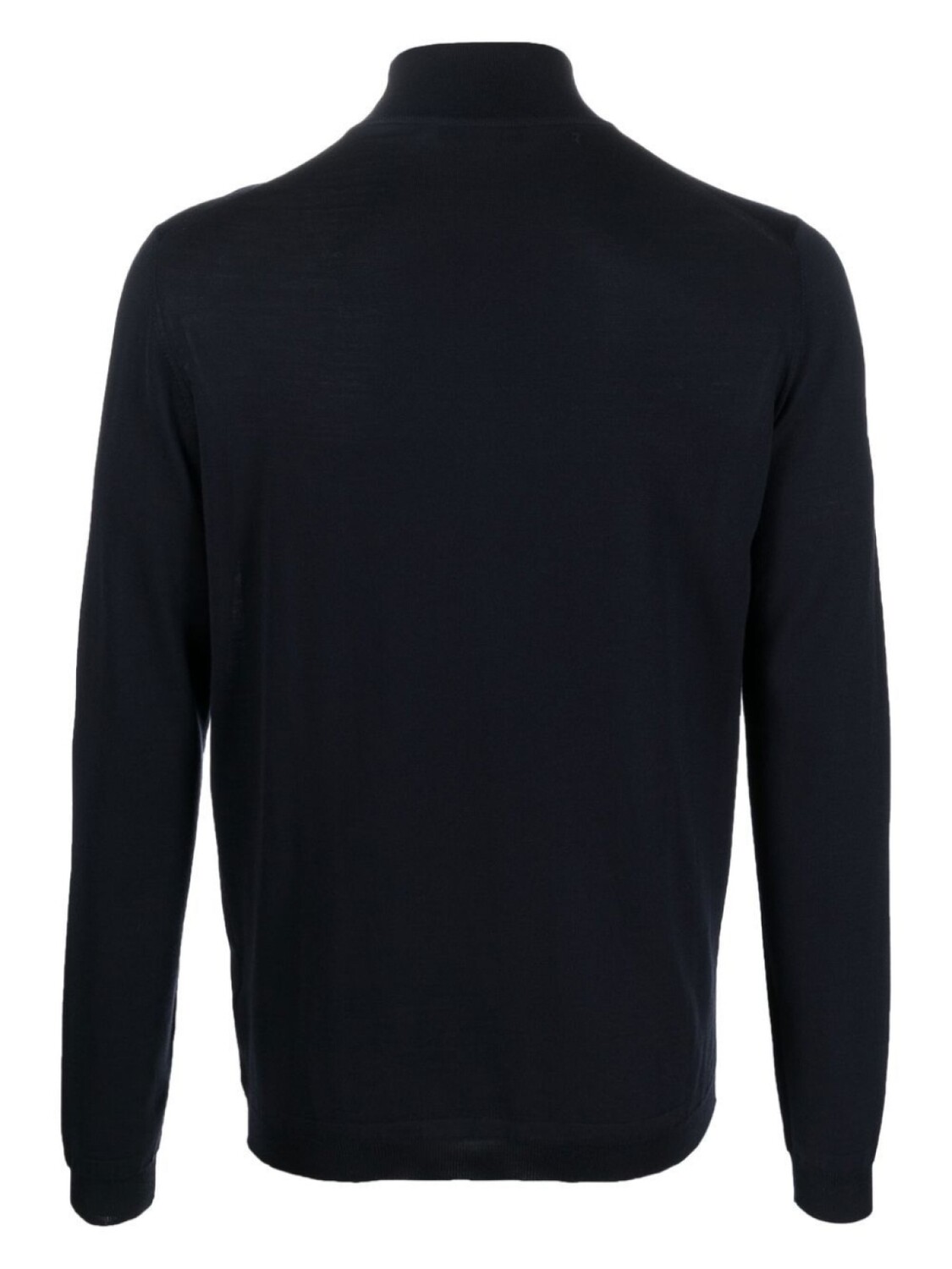 Темно-синий, шерсть мериноса, тонкая вязка, высокий воротник и длинные рукава.