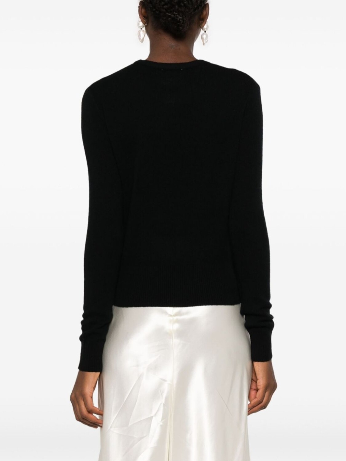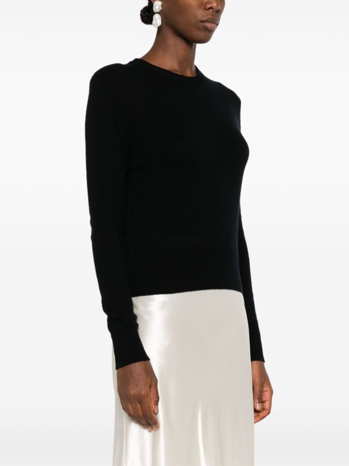 Черный, смесь шерсти и кашемира, тонкая вязка, круглый вырез и длинные рукава.