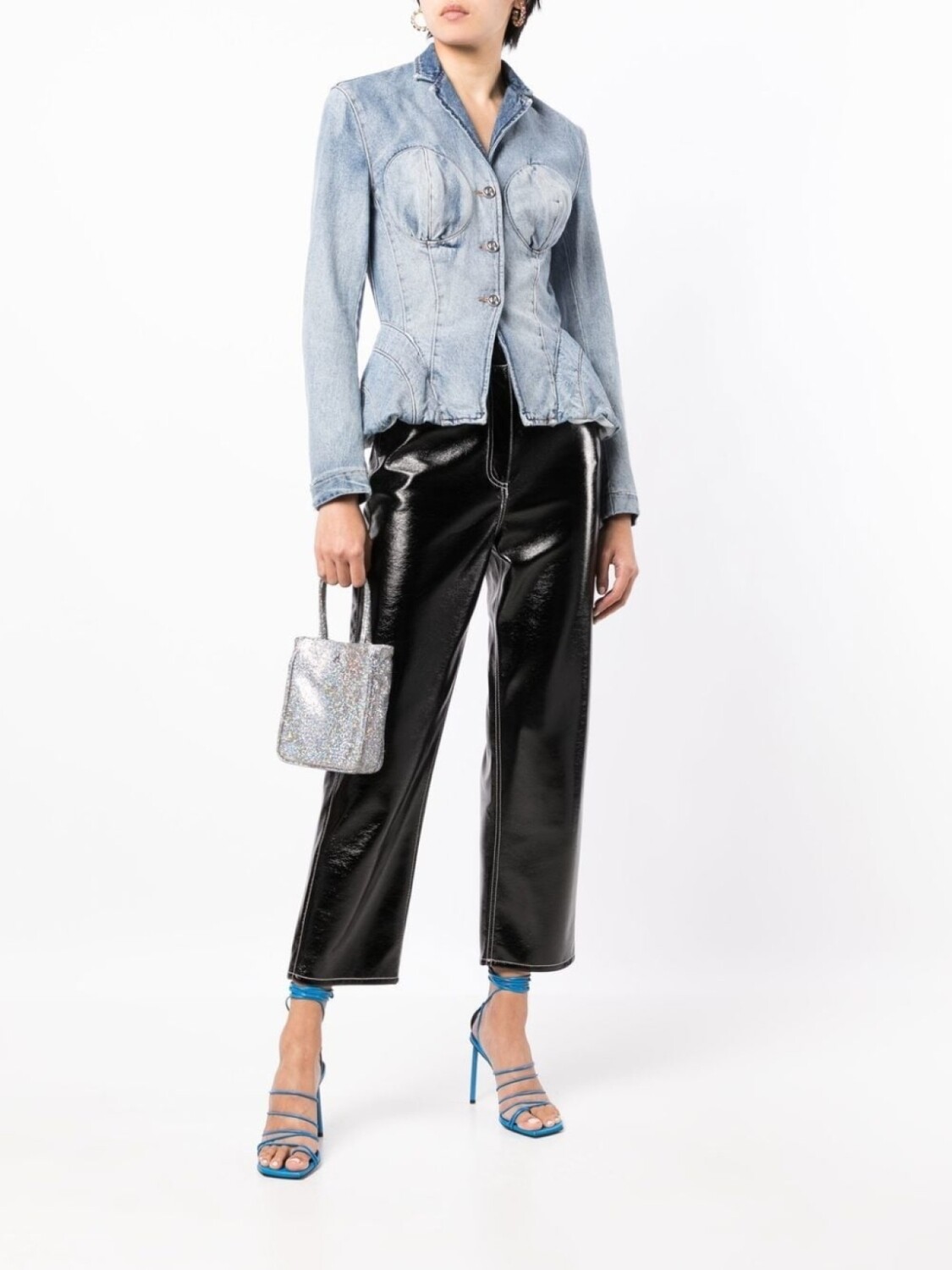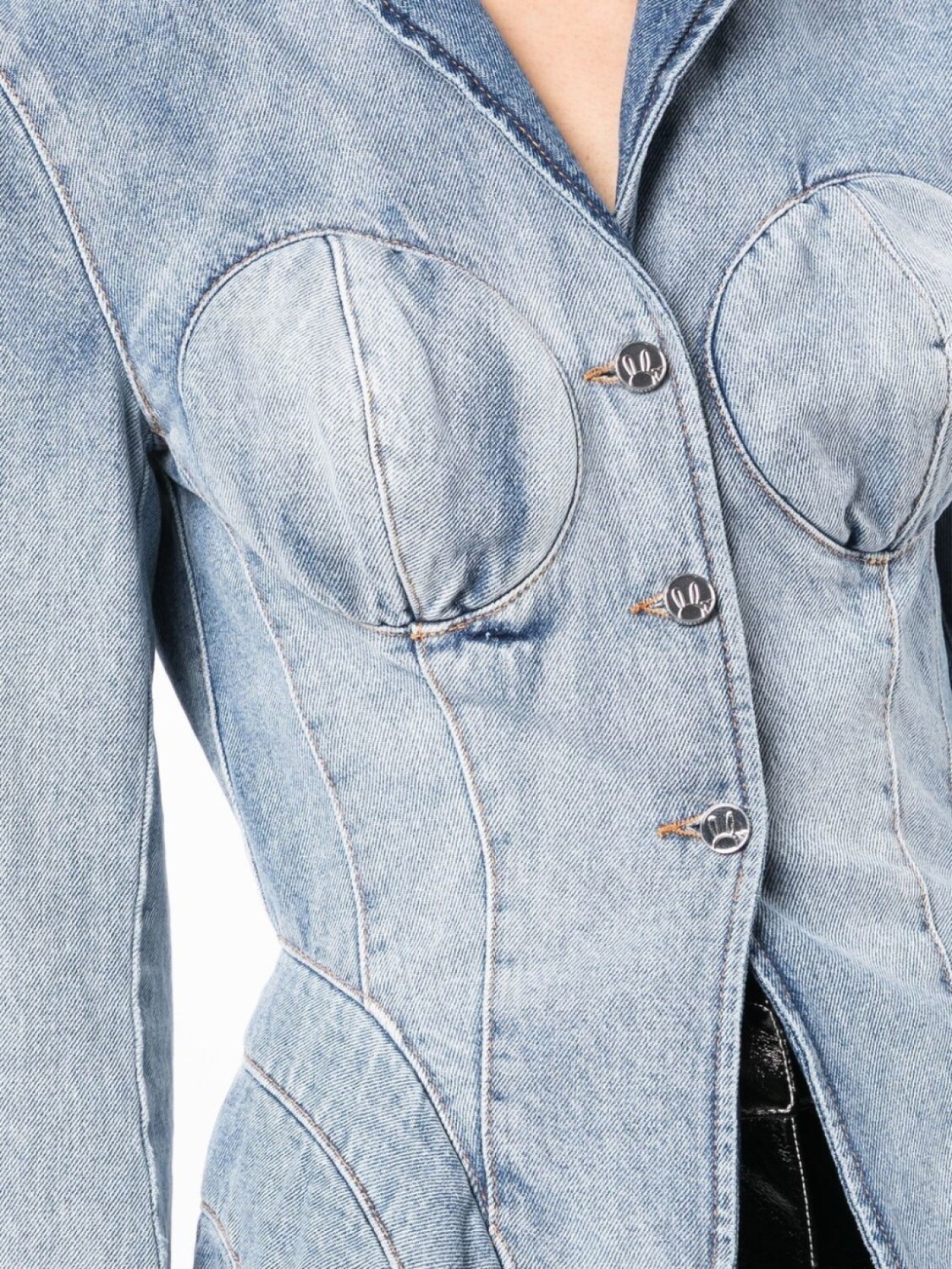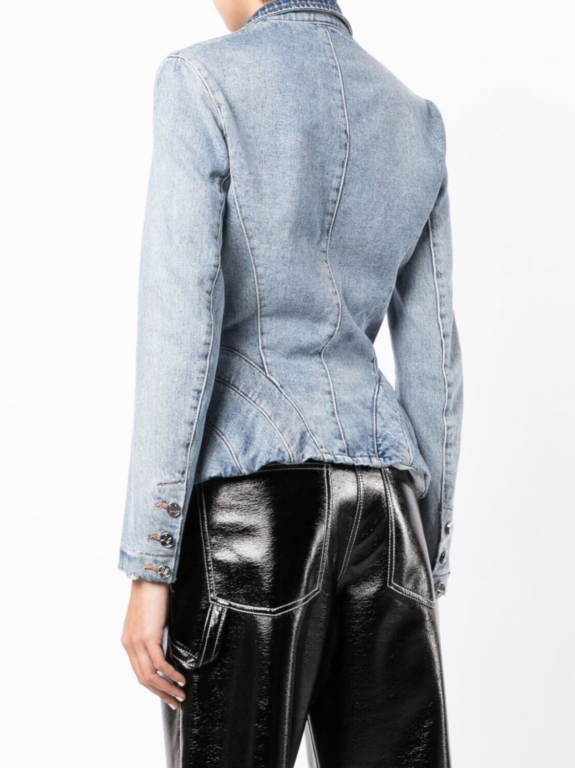 Синий, хлопок, обработанный деним, кольца скульптурной формы, пуговицы с тисненым логотипом, зазубренные лацканы, застежка на пуговицах спереди, длинные рукава и прямой подол.