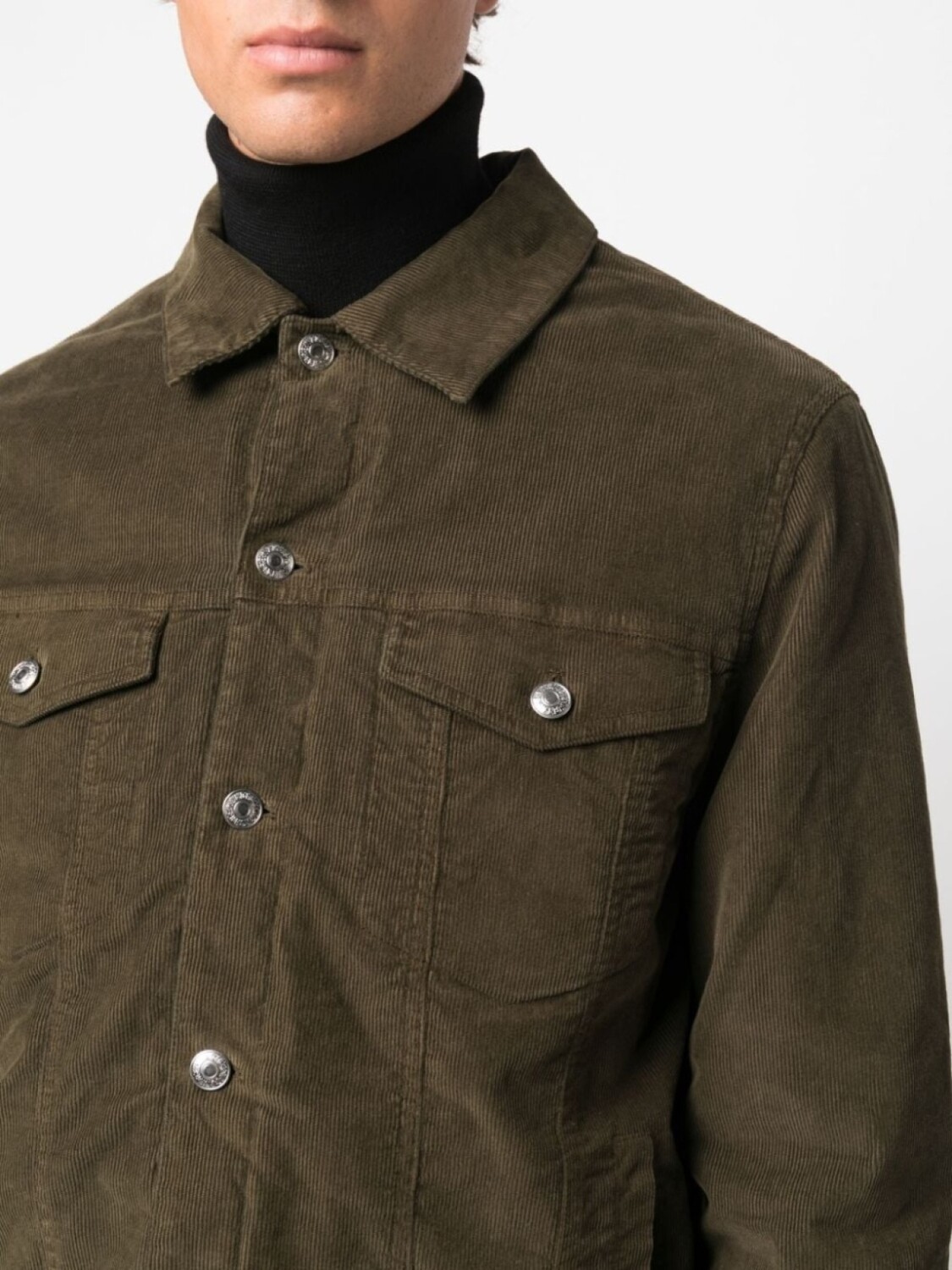 Темно-зеленый, эластичный хлопок, нашивка с логотипом сзади, классический воротник, застежка на пуговицах спереди, длинные рукава, манжеты на пуговицах, два нагрудных кармана с клапанами и прямой подол.