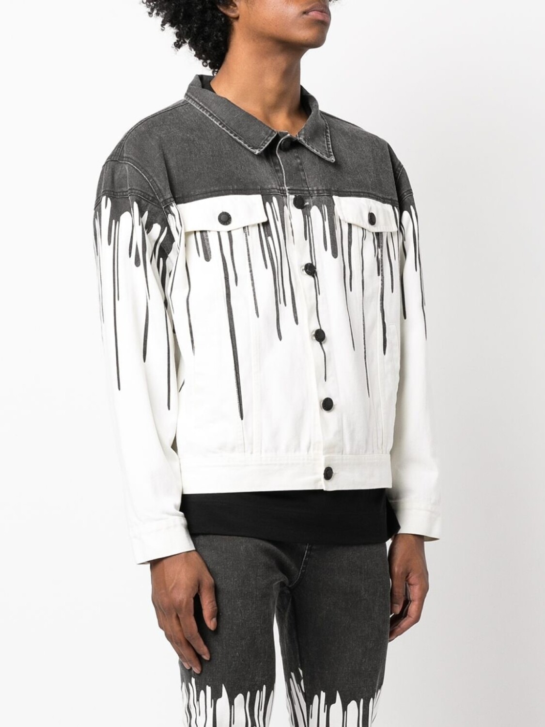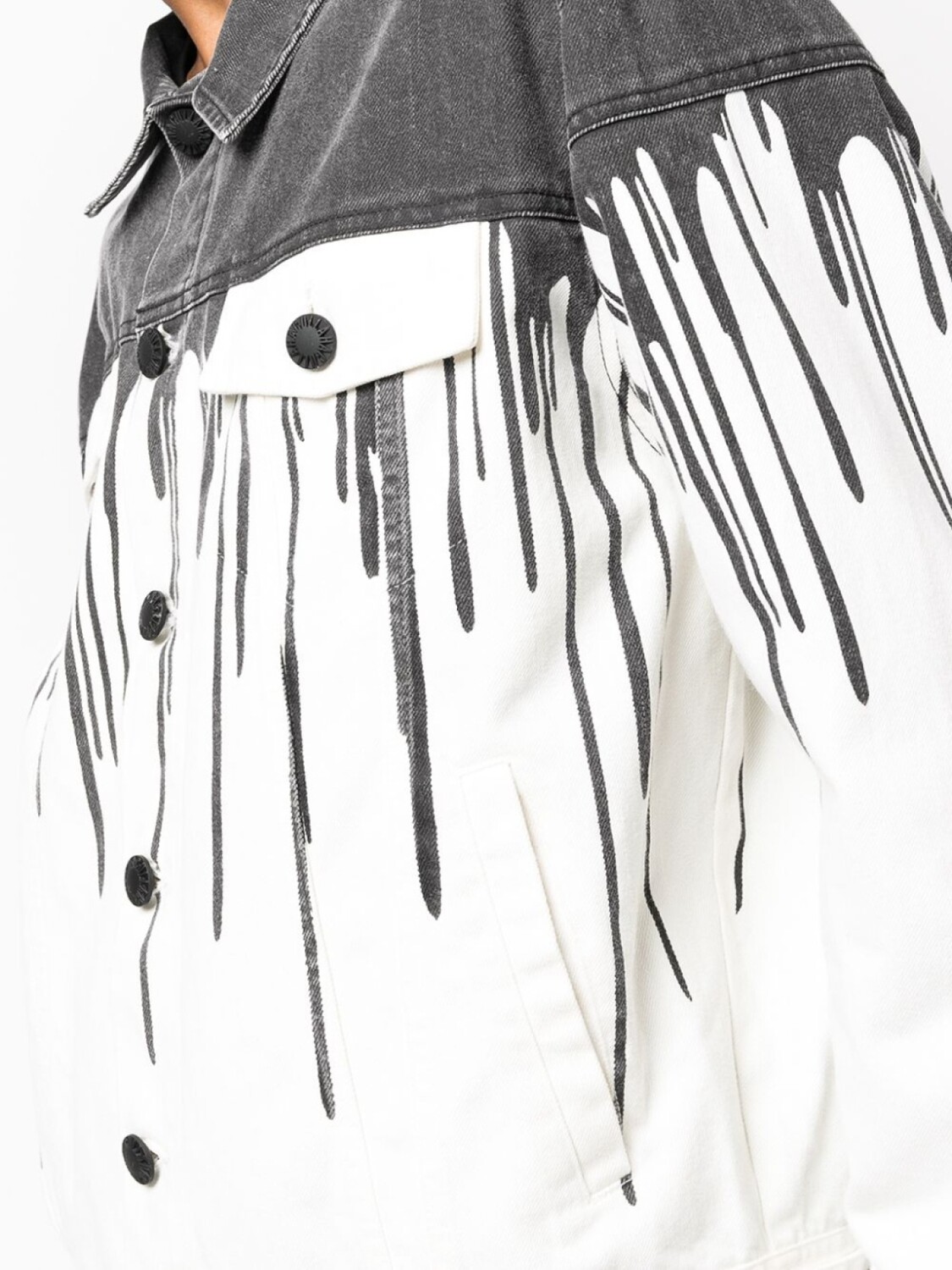 Эффект разбрызганной краски, классический воротник, застежка на пуговицах спереди, длинные рукава, два нагрудных кармана с клапанами и два вшитых кармана по бокам.