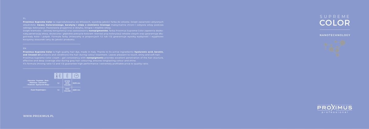 Краска для волос Proximus Supreme Color Nanotechnology – это прорыв в предложении бренда. Это гарантирует новое качество наноокрашивания по исключительно выгодной цене. Формула красителя усовершенствована для волос, которые все чаще подвергаются сильному вредному воздействию внешних и цивилизационных факторов.