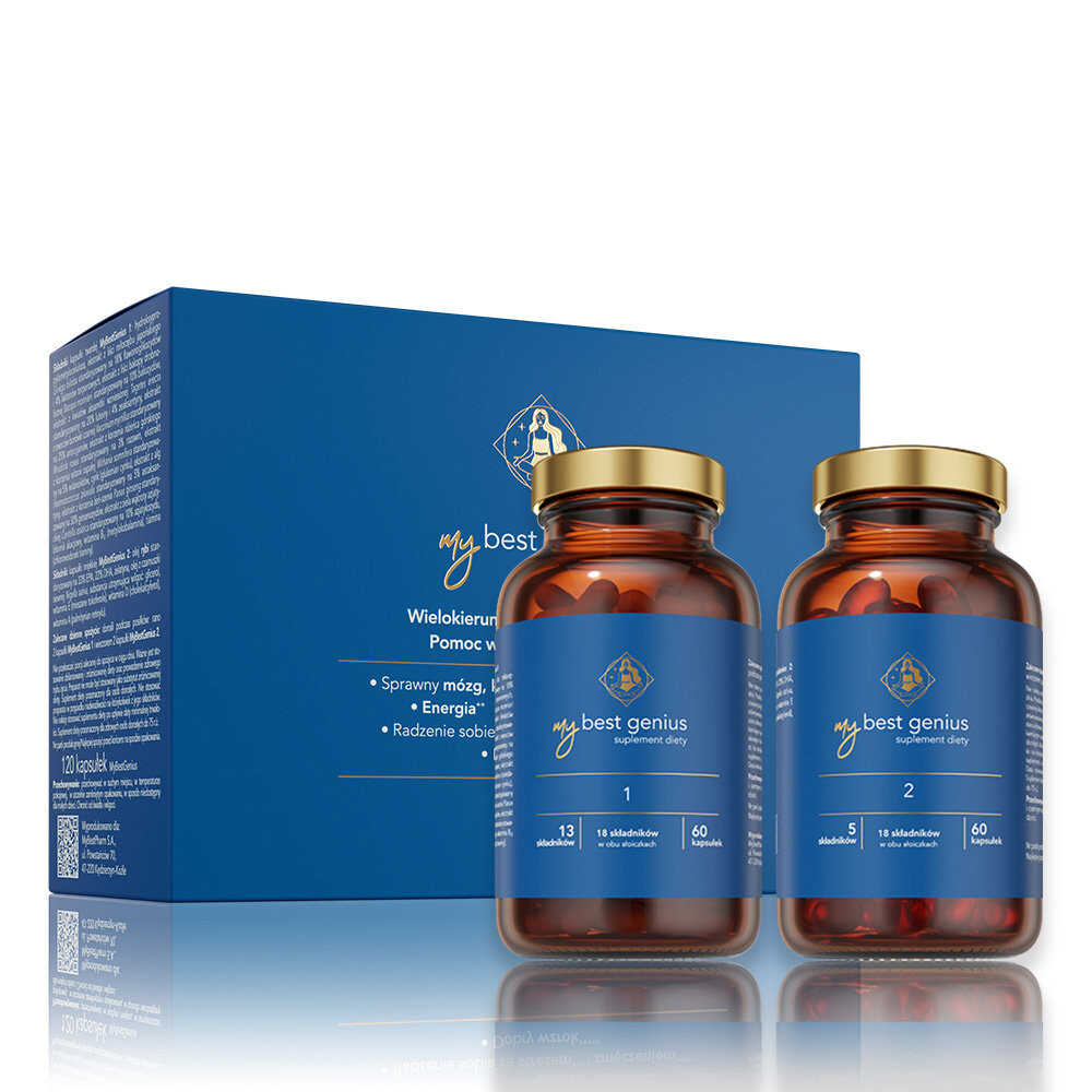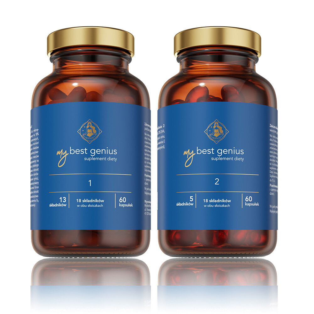 Коктейль молодости для мозга, состоящий из 18 активных ингредиентов, среди которых: адаптогены, антиоксиданты, омега-кислоты, витамины и минералы. Активные ингредиенты MyBestGenius поддерживают работу мозга, концентрацию, внимательность, память, правильное зрение, а также энергию, выносливость и работоспособность вашего тела, особенно в ситуациях, требующих от вас большей умственной и физической активности.