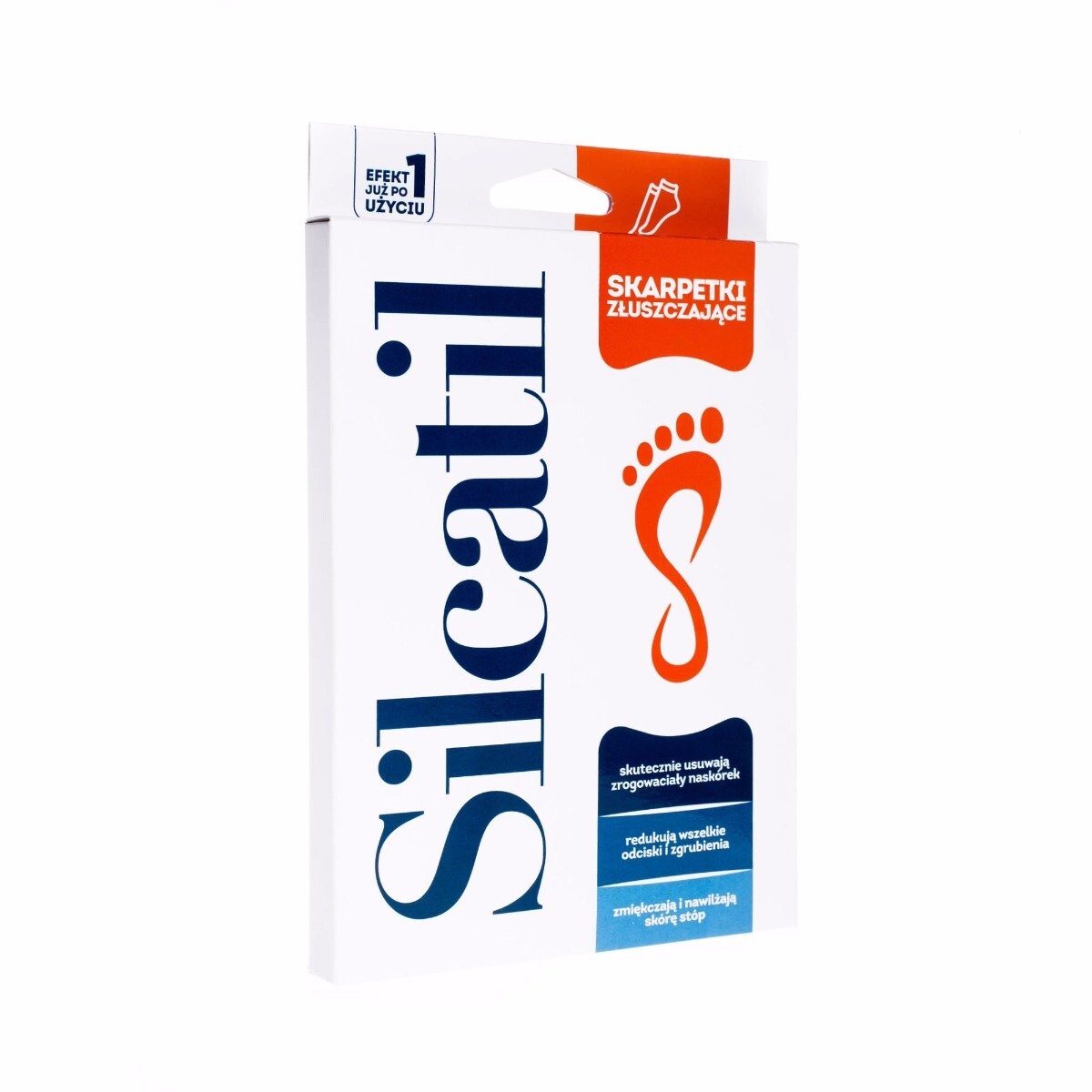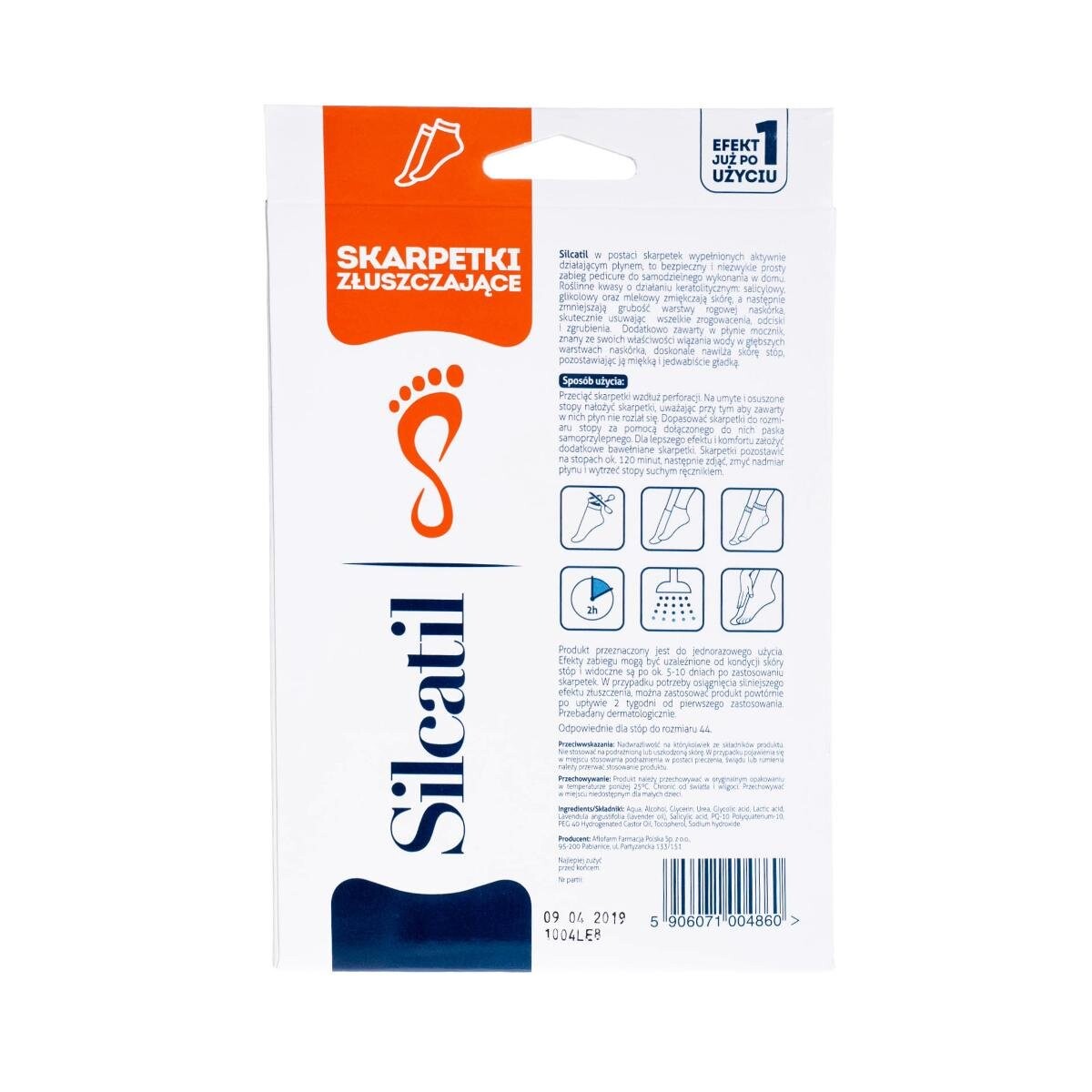 Силкатил в форме носков, наполненных активной жидкостью, – это безопасная и чрезвычайно простая процедура педикюра, которую можно выполнять в домашних условиях. Растительные кислоты с кератолитическими свойствами: салициловая, гликолевая и молочная кислоты смягчают кожу, а затем уменьшают толщину рогового слоя. Кроме того, содержащаяся в жидкости мочевина, известная своей способностью связывать воду в глубоких слоях эпидермиса, прекрасно увлажняет кожу ног, делая ее мягкой и шелковистой. Дерматологически протестировано.