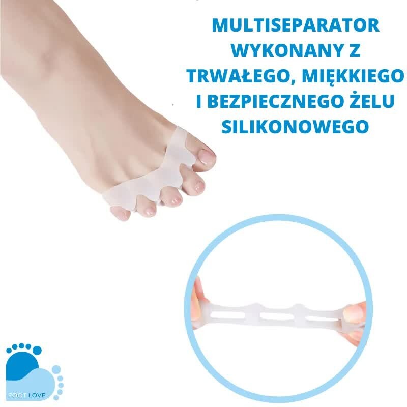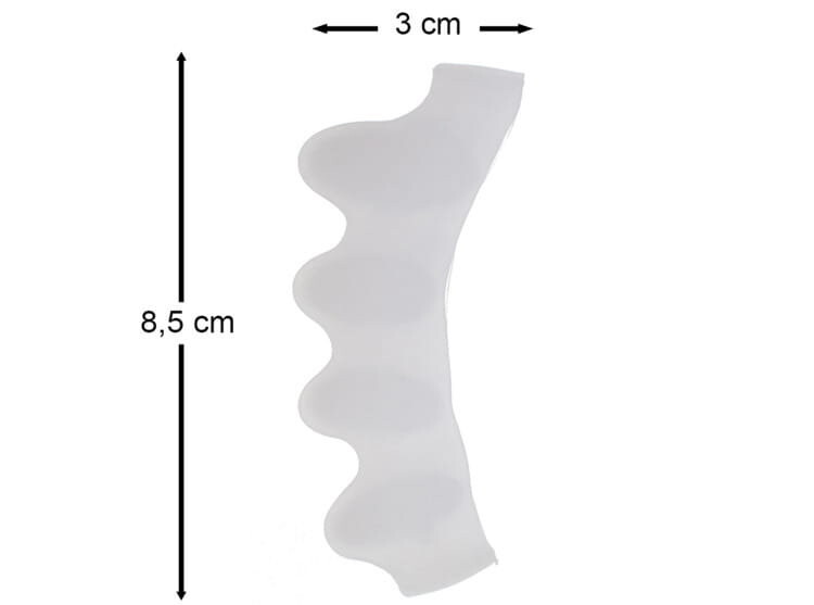 Разделитель должен быть в косметичке каждой женщины, носящей высокие каблуки. Независимо от таких недугов, как шишки или скрюченные пальцы ног, мультисепаратор позволяет расслабить и разъединить сдавленные обувью пальцы ног. Дополнительное утолщение ортеза в подошвенной части приводит к растяжению пальцев при сгибании под нагрузкой. Пятнадцатиминутная прогулка по сепаратору обеспечивает релаксацию. Кроме того, его оздоровительный эффект сочетается с косметическим, поскольку он идеально подходит для ухода за ногтями. Гибкий и эластичный силиконовый гель хорошо адаптируется к ноге и прост в уходе.
