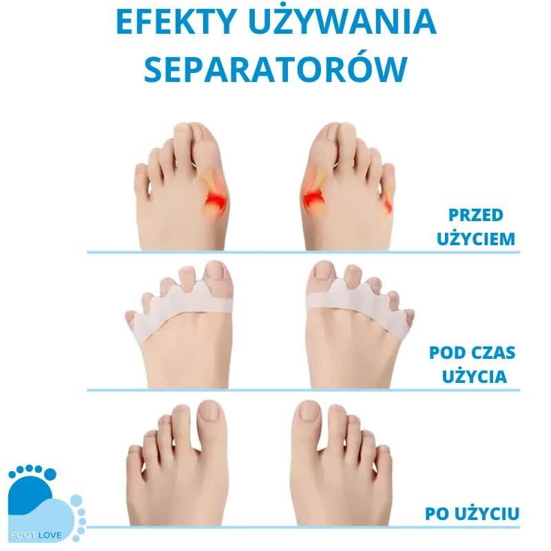 Разделитель должен быть в косметичке каждой женщины, носящей высокие каблуки. Независимо от таких недугов, как шишки или скрюченные пальцы ног, мультисепаратор позволяет расслабиться и разъединить сдавленные обувью пальцы ног. Дополнительное утолщение ортеза в подошвенной части приводит к растяжению пальцев при сгибании под нагрузкой. Пятнадцатиминутная прогулка по сепаратору обеспечивает релаксацию. Кроме того, его оздоровительный эффект сочетается с косметическим, поскольку он идеально подходит для ухода за ногтями. Гибкий и эластичный силиконовый гель хорошо адаптируется к ноге и прост в уходе.