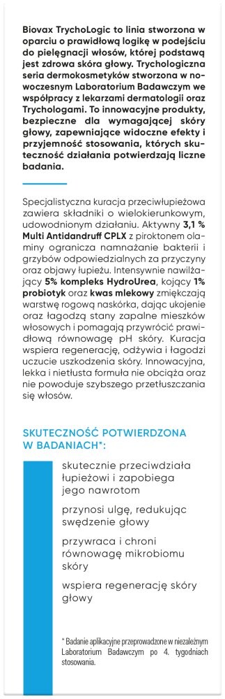 Специализированное средство против перхоти содержит ингредиенты с разнонаправленным, доказанным действием. Активный 3,1% антиперхоть Scalp CPLX с пироктоном оламином ограничивает размножение бактерий и грибков, ответственных за причины и симптомы перхоти. Интенсивно увлажняющий 5% комплекс HydroUrea, успокаивающий 1% пробиотик и молочная кислота смягчают роговой слой эпидермиса. успокаивает и успокаивает воспаление волосяных фолликулов и помогает восстановить правильный pH-баланс кожи. Сыворотка поддерживает регенерацию кожи и питает ее. Инновационная, легкая и нежирная формула не утяжеляет волосы и не делает их быстрее жирными.