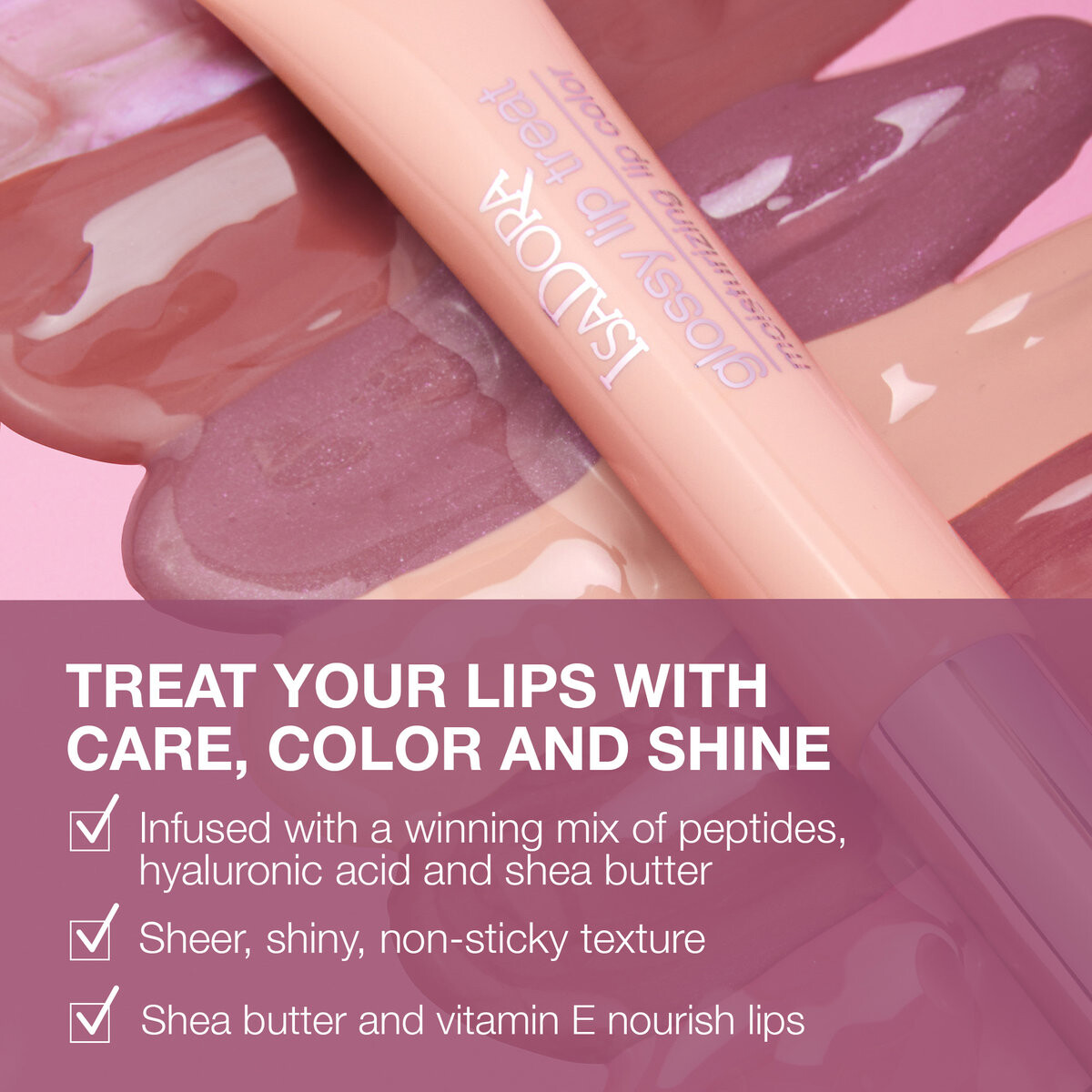 GLOSSY LIP TREAT БЛЕСК В ТЮБИКЕ С ЛЕГКОЙ КОНСИСТЕНЦИЕЙ. ПИТАНИЕ И УХОД ЗА ВАШИМИ ГУБАМИ. СОДЕРЖИТ ГИАЛУРОНОВУЮ КИСЛОТУ, МАСЛО ШИ, МАСЛО ЖОЖОБА И ПЕПТИДЫ.