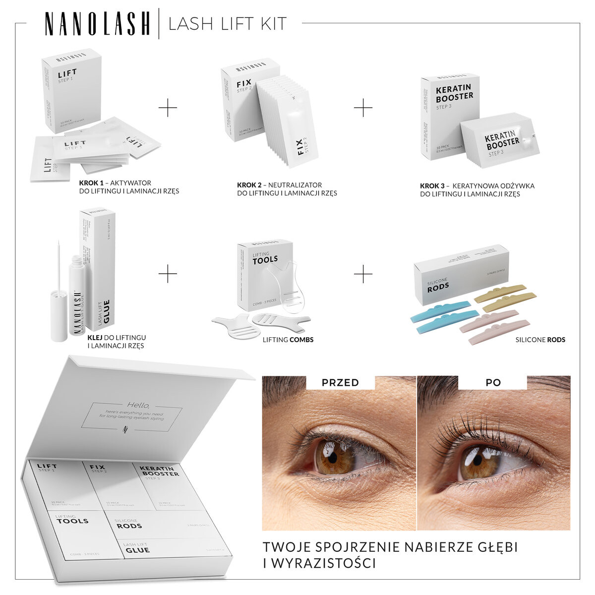 - ПЛОТНОСТЬ И БЛЕСК РЕСНИЦ- набор для ламинирования ресниц Nanolash содержит продукты, которые питают и укрепляют ресницы, делая их гуще блестящий и здоровый. Благодаря этому вы добьетесь эффекта густых и блестящих ресниц.