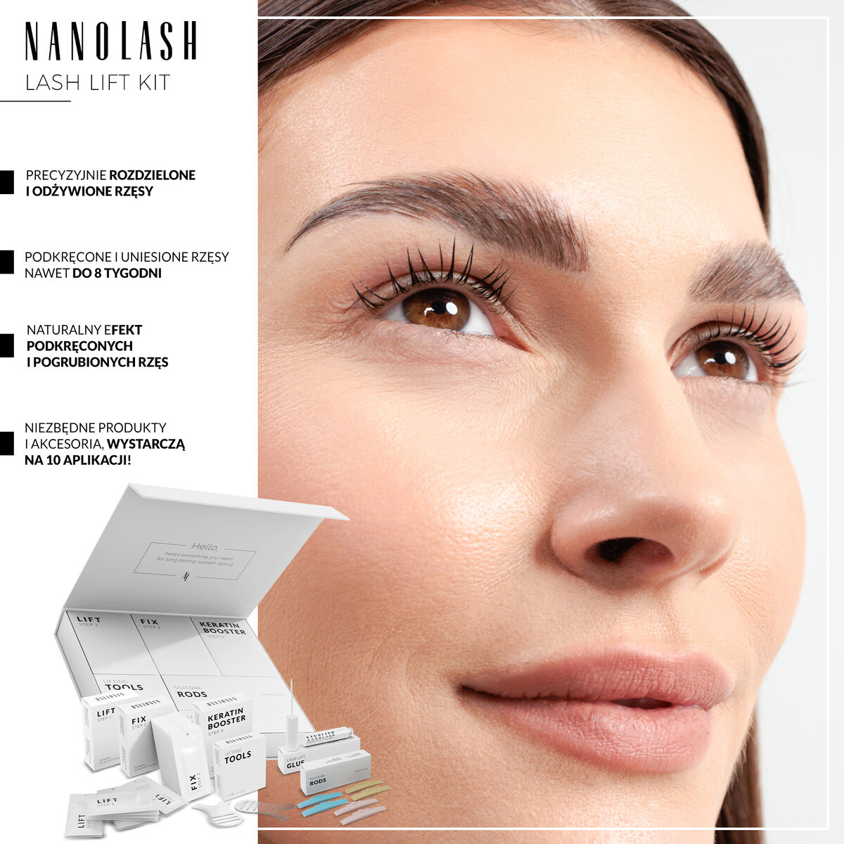 - ВОСХИТИТЕЛЬНЫЙ ЛИФТИНГ РЕСНИЦ- лифтинг ресниц, выполненный набором от Nanolash, поднимет ваши ресницы от корней, сделав их красиво подкрученными и приподнятыми . Ваш взгляд станет глубже и выразительнее.