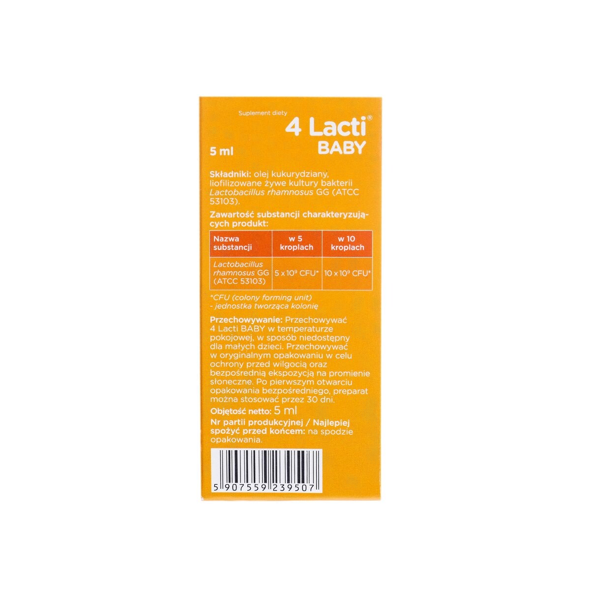 4 Lacti Baby содержит лиофилизированные живые культуры бактерий Lactobacillus rhamnosus GG (ATCC 53103). и кукурузное масло.