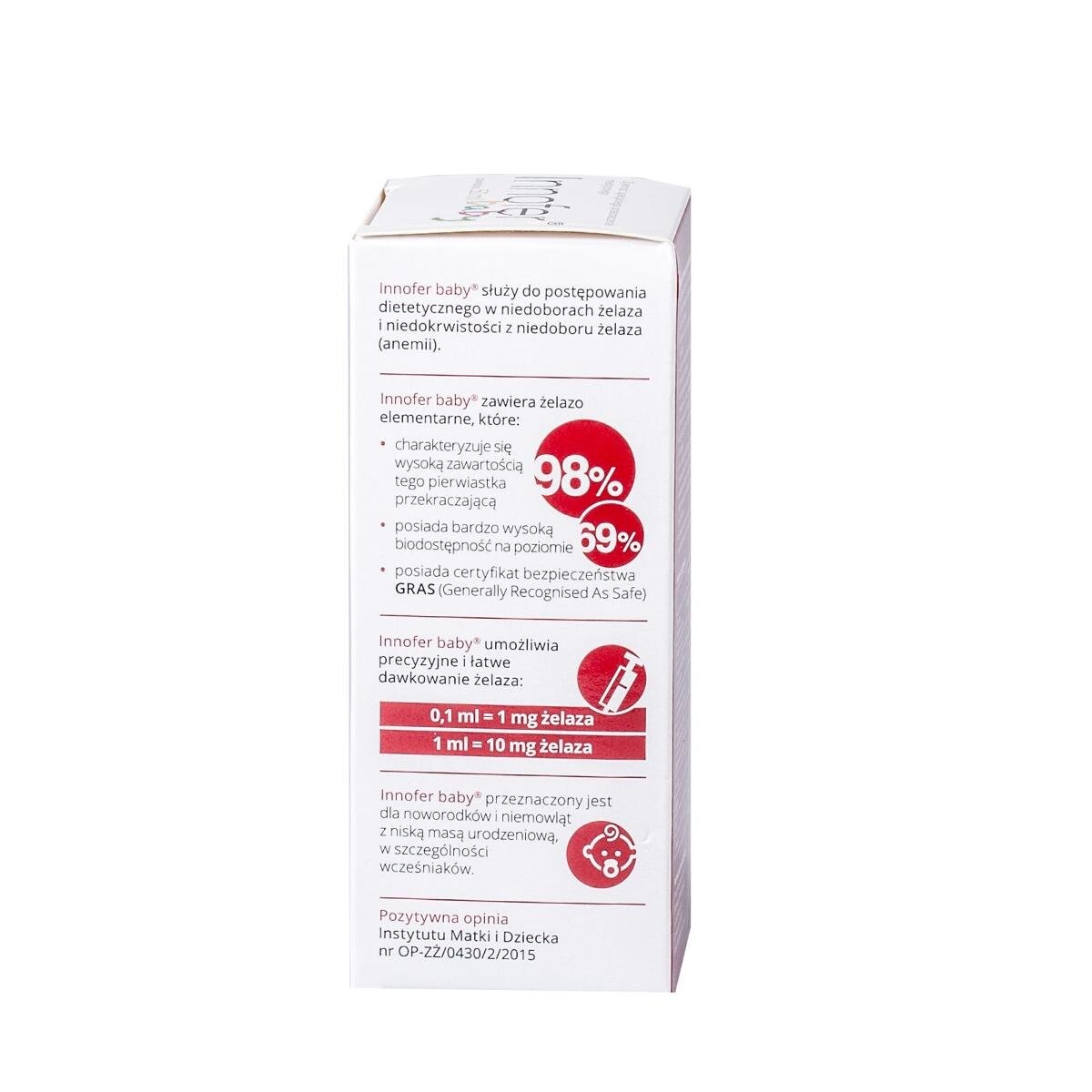 Пероральная суспензия, содержащая элементарное железо. Используется для профилактики дефицита железа и железодефицитной анемии (анемии). Иннофер Бэби характеризуется высоким содержанием железа, превышающим 98%, а его биодоступность находится на уровне 69% эффективных доз. Он в 30-150 раз безопаснее по сравнению с растворимыми солями железа. Он не вызывает боли в животе, диареи или запора. Он также не вызывает металлического привкуса и эффекта обесцвечивания зубов, поскольку в желудочно-кишечном тракте под воздействием желудочного сока превращается в ионизированную форму. Препарат имеет сертификат безопасности GRAS (Generally Recnowed As Safe). Также имеется положительное заключение Института матери и ребенка. Средство можно применять у новорожденных, младенцев и детей. Рекомендуется применять препарат под наблюдением врача.