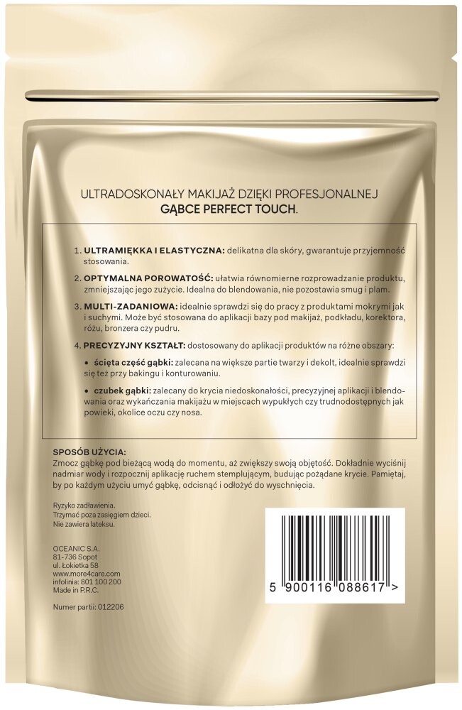 УЛЬТРАМЯГКИЙ И ЭЛАСТИЧНЫЙ: нежный для кожи, гарантирует приятное нанесение. ОПТИМАЛЬНАЯ ПОРИСТОСТЬ: способствует равномерному распределению продукта, сокращая его расход. Идеально растушевывается, не оставляет полос и пятен. МНОГОФУНКЦИОНАЛЬНОСТЬ: идеально подходит для работы с влажными и сухими продуктами. Его можно использовать для нанесения основы под макияж, тонального крема, консилера, румян, бронзатора или пудры. ПРОФЕССИОНАЛЬНАЯ ФОРМА: адаптирована для нанесения продуктов на различные зоны: • скошенная часть спонжа: рекомендуется для больших участков лица и декольте, также идеально подходит для запекания и контурирования. • Кончик спонжа: рекомендуется для маскировки недостатков, точного нанесения и растушевки, а также завершения макияжа в выпуклых или труднодоступных местах, таких как веки, вокруг глаз или носа. Приготовление и применение: Смочите губку под проточной водой до пока он не увеличится в объеме. Тщательно отожмите излишки воды и начните наносить постукивающими движениями, создавая желаемое покрытие. Не забывайте мыть губку после каждого использования, отжимать ее и оставлять сохнуть.