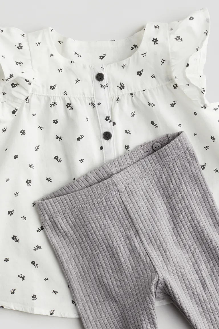 Бренд: H&M Цвет: серый Новинка Комплект из блузки и леггинсов из мягкого хлопка. Блузка из ткани, застегивающаяся на пуговицы, с круглым вырезом, кокеткой и рукавами с воланами. Леггинсы из трикотажа в рубчик с регулируемым эластичным поясом и оверлочными швами. Штуков/пар: 2 Длина: Длинная, Стандартная длина Высота талии: Нормальный пояс Длина рукава: Короткий рукав Вырез: круглый вырез Фон рукава: рукав с воланом Что нужно знать: регулируемый пояс