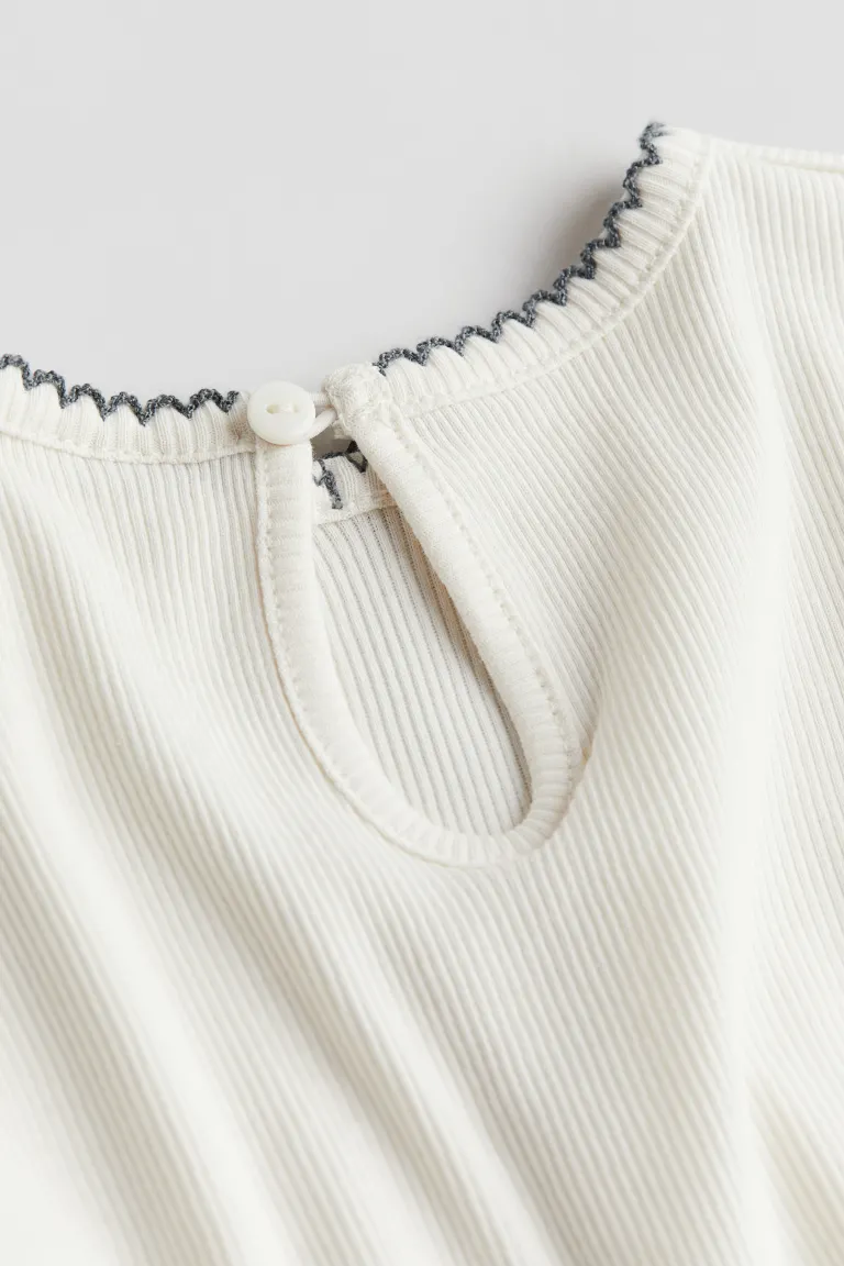 Топ из мягкого хлопкового трикотажа в рубчик с круглым вырезом, отделанным пико, и небольшим атласным бантиком. Вырез «капля» на пуговице сзади, манжеты и нижний край с оверлоком.