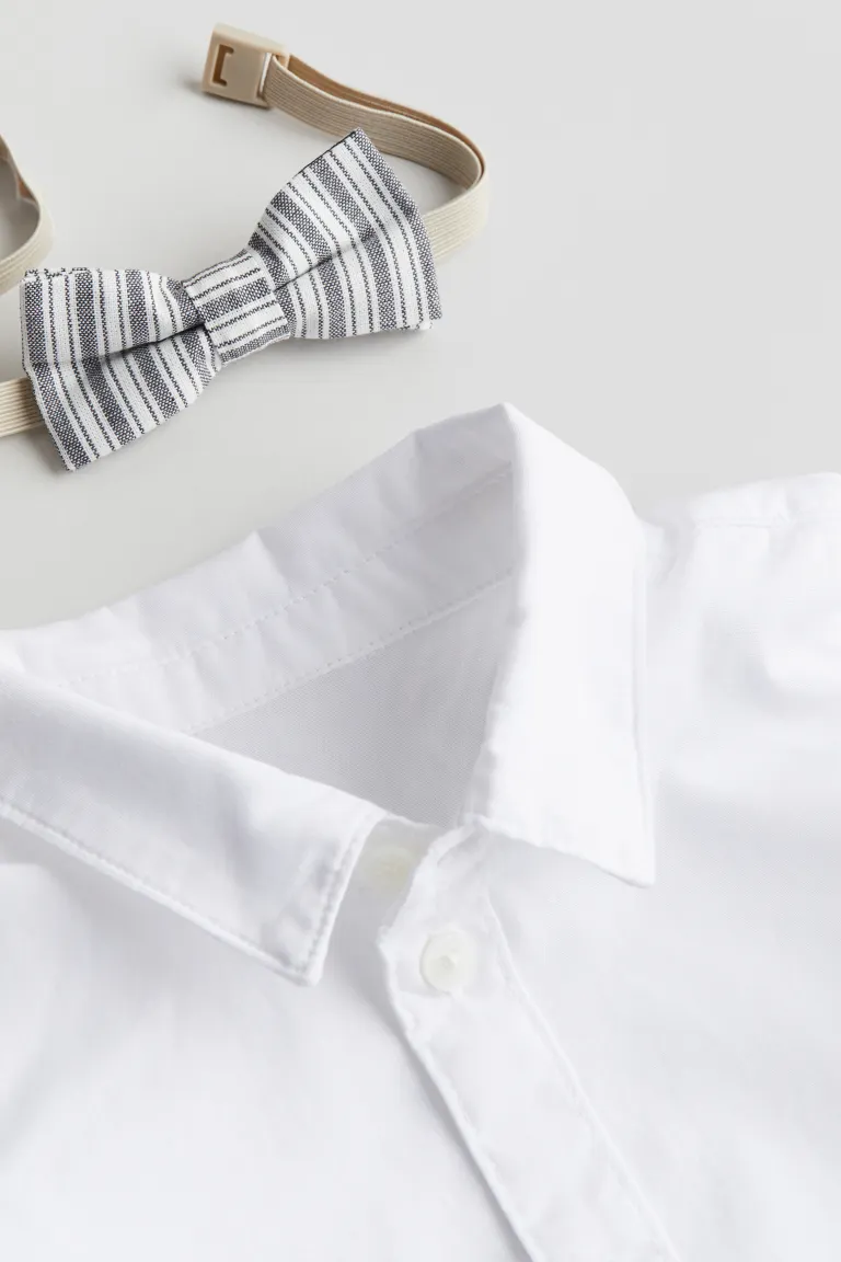 Бренд: H&M Цвет: белый Комплект из хлопковой рубашки, шорт в тон и заранее завязанного галстука-бабочки из смеси хлопка и льна. Рубашка с короткими рукавами, отложным воротником, планкой на пуговицах и слегка закругленным низом. Шорты с регулируемым эластичным поясом, ложными ширинками и ложными карманами спереди и сзади. Соответствующий галстук-бабочка с регулируемой резинкой и пластиковой застежкой на шее. Количество штук/пар: 3 Длина: Стандартная длина, Короткая Высота талии: Нормальная высота талии Длина рукава: Короткий рукав Воротник: отложной -Воротник Полезно знать: регулируемый пояс