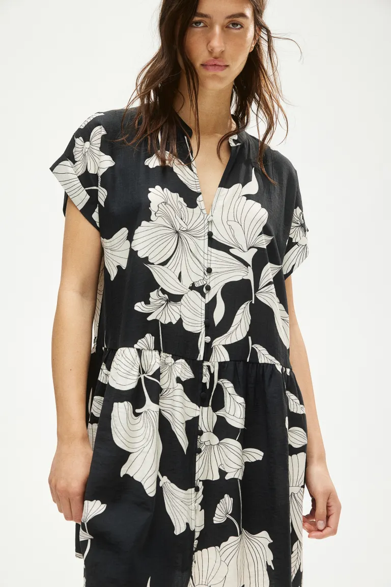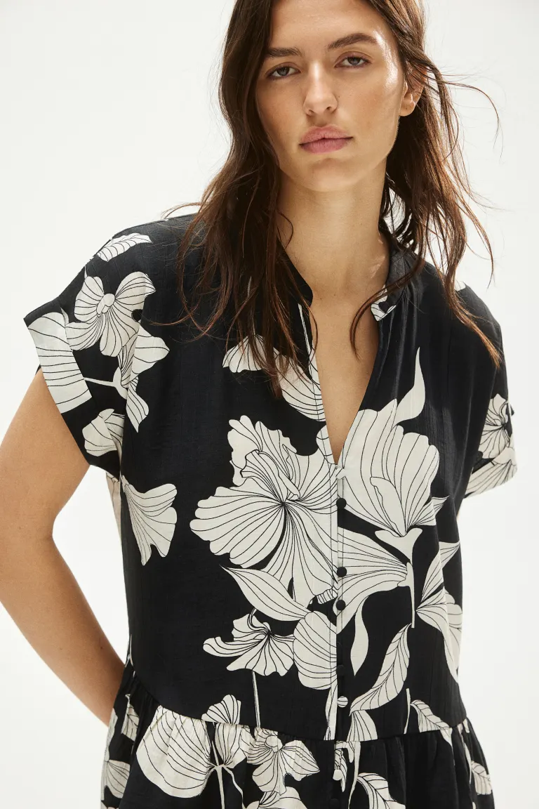 Бренд: H&M Цвет: черный Новинка Короткое повседневное платье-туника из жатой ткани с воротником-стойкой и V-образным вырезом. Короткие рукава с манжетами, обтянутые пуговицы спереди и присборенный шов на бедрах для дополнительного объема. Без подкладки. Размер: Спина: Длина: 92,0 см (размер M) Длина: Короткая Длина рукава: Короткий рукав Посадка: Свободный крой Воротник: Ленточный воротник Стиль: Туника Вырез: V-образный