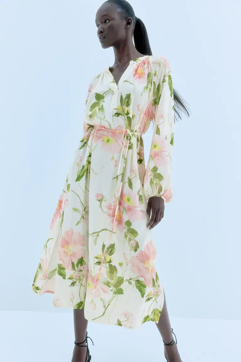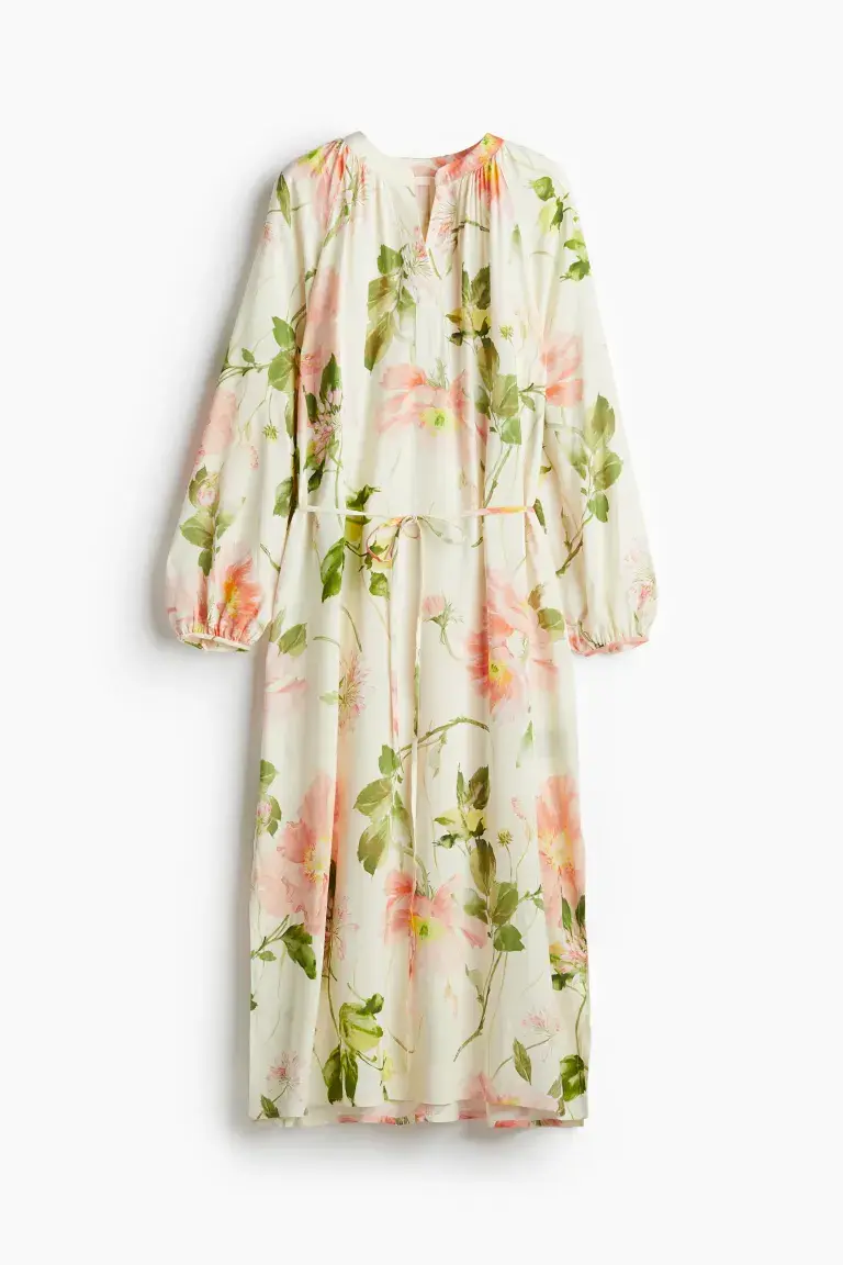 Бренд: H&M Цвет: бежевый Новинка Платье длиной до икры из тканого материала с рюшами по горловине, V-образным вырезом спереди и свободным кроем. Длинные рукава-фонарики кроя реглан с пуговицей и узкой окантовкой по низу. Узкий съемный пояс на талии и прямой низ с разрезами по бокам. Без подкладки. Размер модели: рост модели 180 см/5 футов 11 дюймов, размер M. Размер: Рукав: Длина: 72,0 см (размер M), спинка: Длина: 124,0 см (размер M). , Разрез: Высота: 39,0 см (размер M) Длина: Миди Длина рукава: Длинный рукав Посадка: Свободный крой Воротник: Лента Вырез: V-образный Стиль рукава: рукав с воздушным шаром