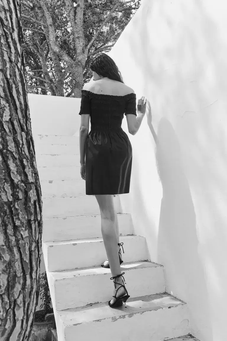 Короткое платье без плеч из тканого материала с облегающим лифом и короткими рукавами, каждый с дымчатыми вставками. Узкая воланная отделка сверху, рюши на талии и расклешенная юбка. Без подкладки.