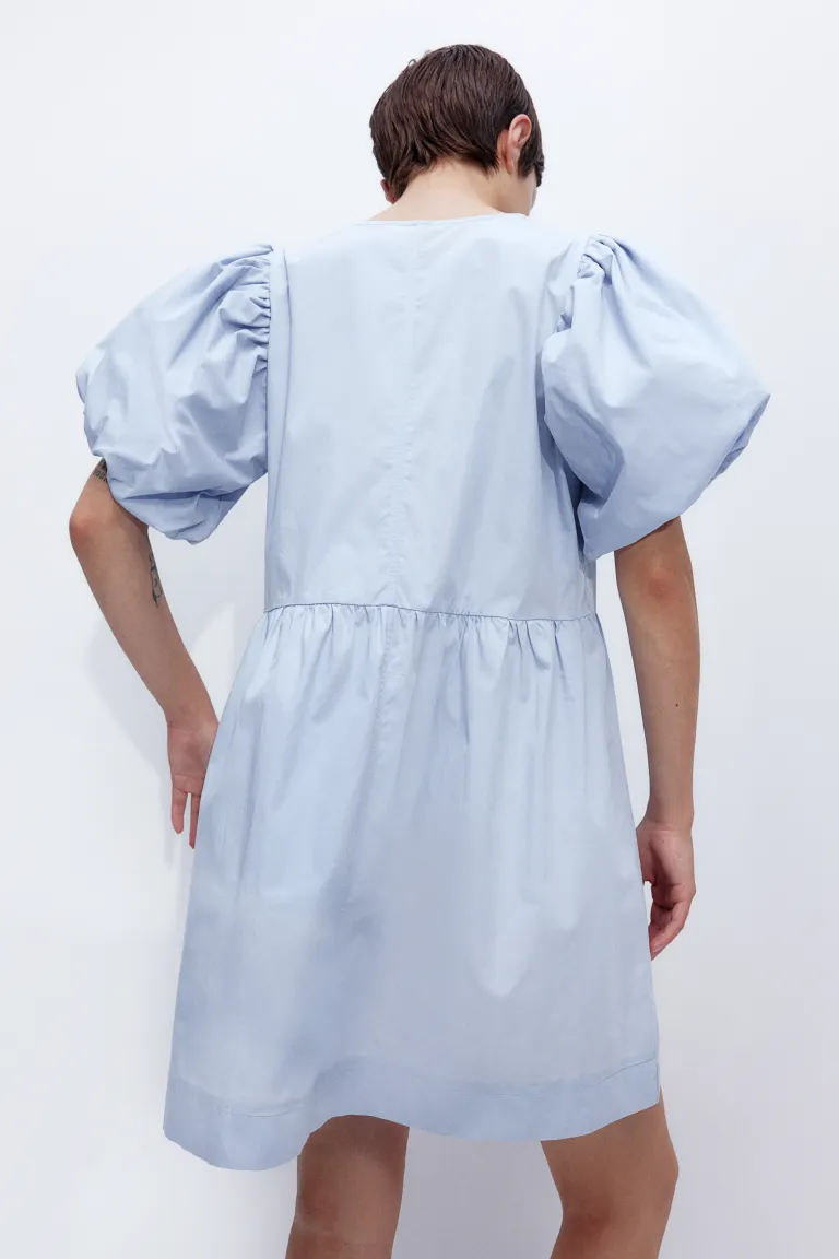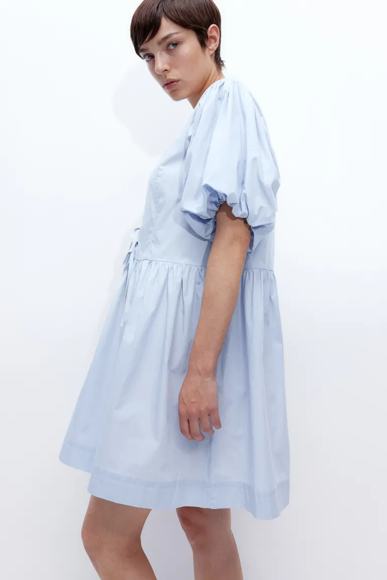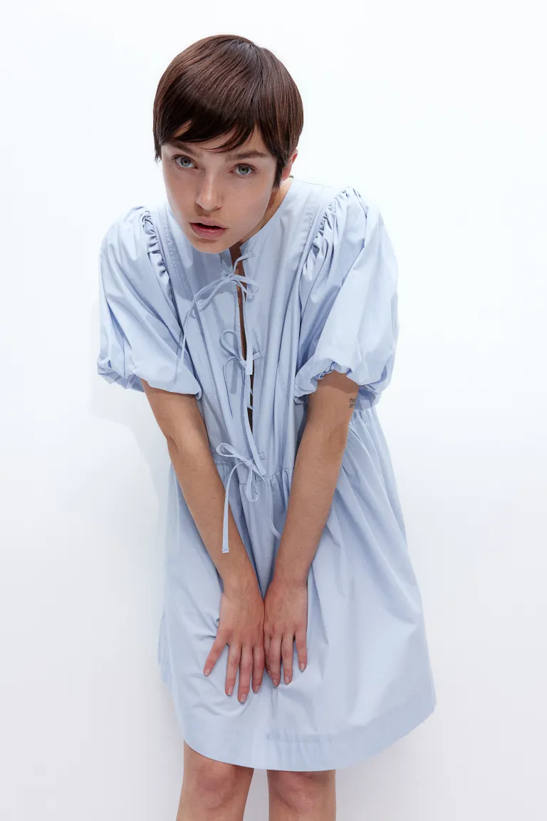 Бренд: H&M Цвет: синий Новинка Короткое хлопковое платье с круглым вырезом и облегающим лифом с вырезом и тремя парами узких завязок спереди. Короткие объемные рукава-фонарики с узкой резинкой на манжетах и расклешенной частью юбки, собранной сверху. Рукава на подкладке. Рост модели: рост модели 177 см/5 футов 10 дюймов, размер M. Длина: короткая Длина рукава: короткий рукав Посадка: стандартная Стиль Модель: Расклешенная, завязка спереди Вырез: круглый вырез Фонировка рукавов: рукава-фонарики Концепция: РАЗДЕЛЕННАЯ