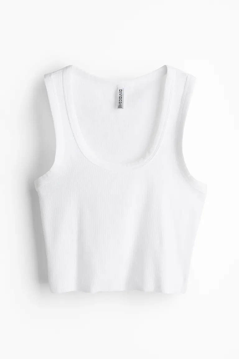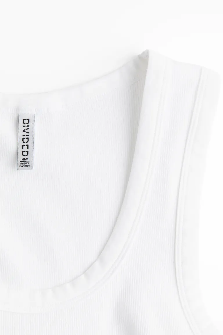 Бренд: H&M Цвет: белый Короткая майка из трикотажа в рубчик. Модель облегает фигуру, имеет широкий круглый вырез горловины и узкую окантовку горловины и проймов рукавов. Низ с необработанным краем. Рост модели: рост модели 180 см/5 футов 11 дюймов, размер S. Длина: короткая Длина рукава: без рукавов Посадка: облегающая Стиль: Майка Вырез: Глубокий вырез Концепция: БАЗОВЫЕ, РАЗДЕЛЕННЫЕ