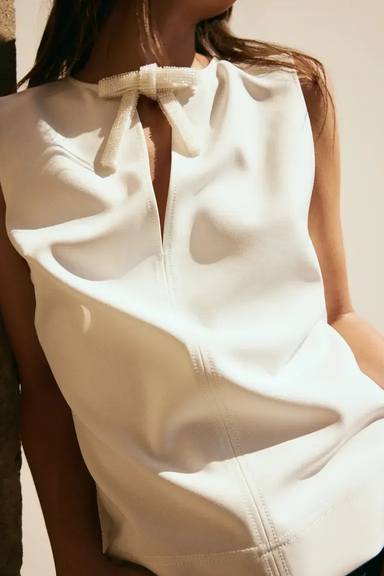 Бренд: H&M Цвет: белый Новинка Топ из эластичной ткани с круглым вырезом и V-образным вырезом с декоративным бантом из бисера спереди. Потайная молния с застежкой на крючок сзади. Рост модели: рост модели 179 см/5 футов 10 дюймов, размер S. Длина: стандартная длина Длина рукава: без рукавов Подгонка : Классический крой Фильм: Капюшон Вырез: Круглый вырез Концепция: H&M EDITION
