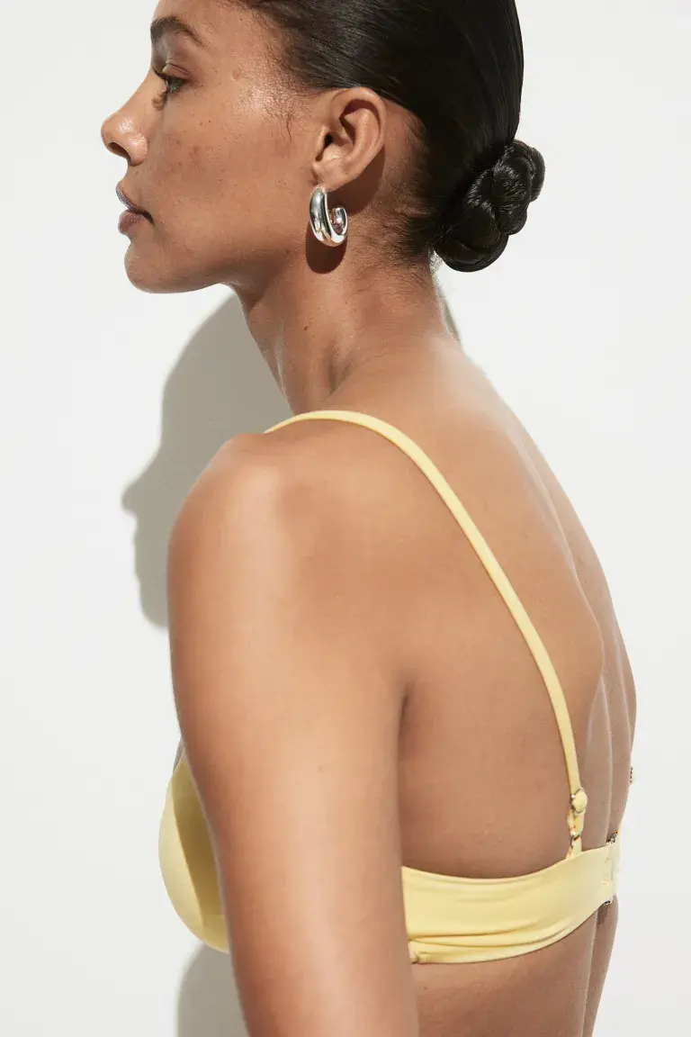 Бренд: H&M Цвет: желтый Уплотненный верх бикини с U-образной косточкой спереди. Чашечки без косточек со съемными вставками, которые придают груди форму и обеспечивают хорошую поддержку. Регулируемые бретели и металлическая застежка сзади. Размер модели: рост модели 180 см/5 футов 11 дюймов, на ней размер 36. Стиль: бюстгальтер без бретелей, бюстгальтер с мягкой подкладкой Что вам нужно знать: Мягкий