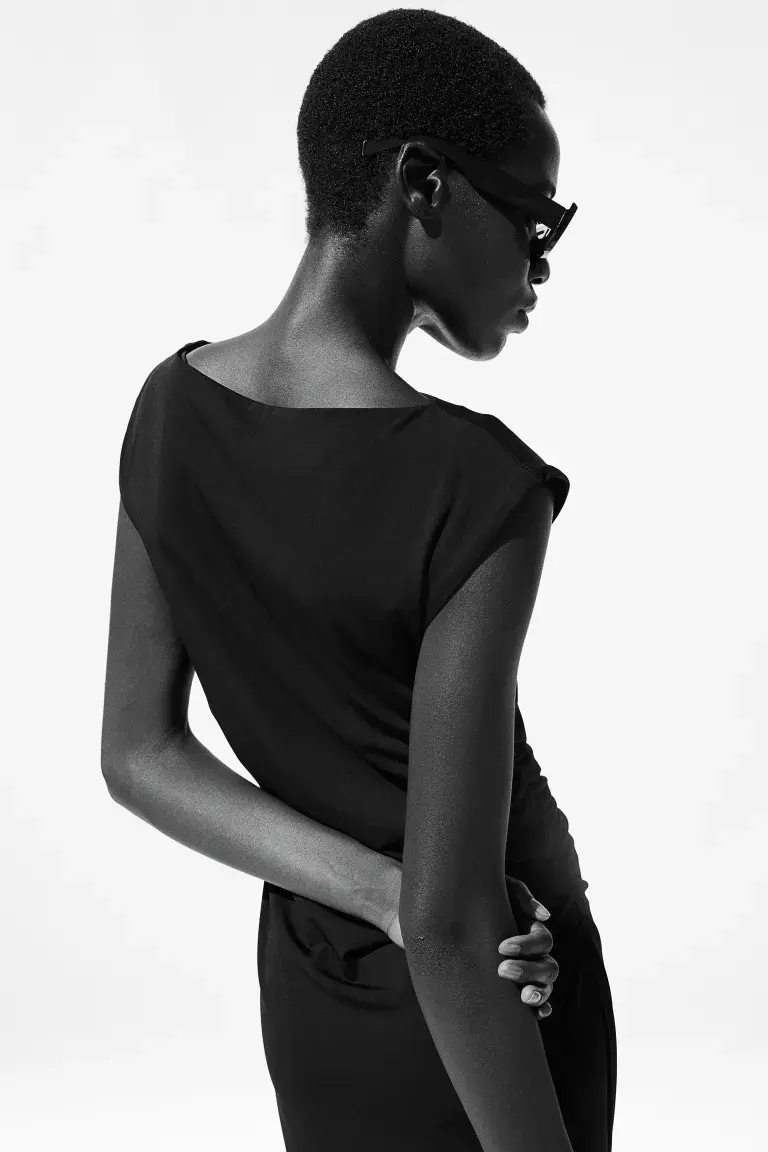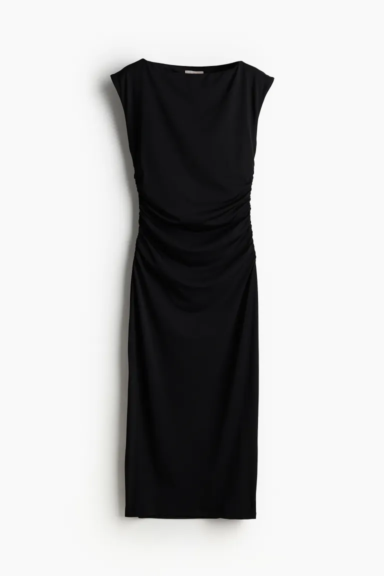 Бренд: H&M Цвет: черный Новинка Облегающее фигуру платье длиной до икры из эластичного трикотажа с вырезом-лодочкой, рукавами-крылышками и оборками на талии. На подкладке сверху. Размер модели: рост модели 177 см/5 футов 10 дюймов, размер M. Размер: Спина: Длина: 118,0 см (размер M) Длина: миди Длина рукава: без рукавов Посадка: приталенная Стиль: облегающий Вырез: лодочка Фильм рукава: короткий рукав