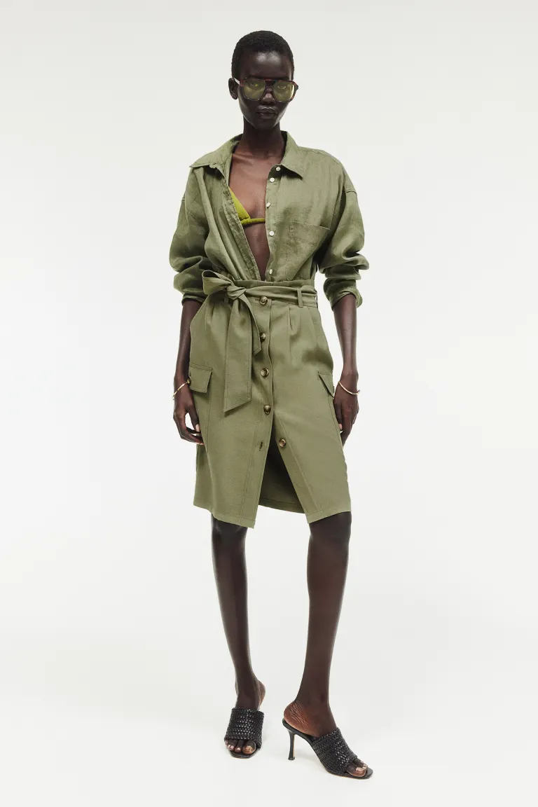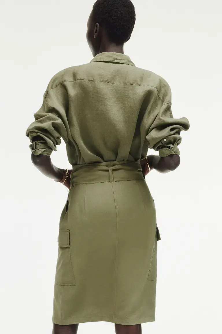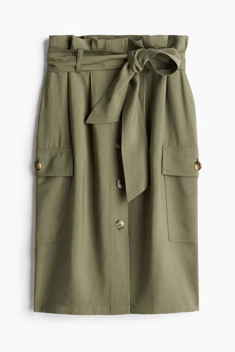 Бренд: H&M Цвет: зеленый Юбка длиной до колена, застегивающаяся на пуговицы, с поясом из бумажного пакета, складками спереди и съемным поясом. Косые боковые карманы и накладные карманы с клапаном и пуговицей. Без подкладки. Размер модели: рост модели 179 см/5 футов 10 дюймов, на ней размер 36. Размер: Талия: Окружность: 78,0 см (размер 40), спина: Длина: 65,0 см (размер 40). Длина: до колена Высота талии: нормальная высота талии Посадка: стандартная Фильм: карго