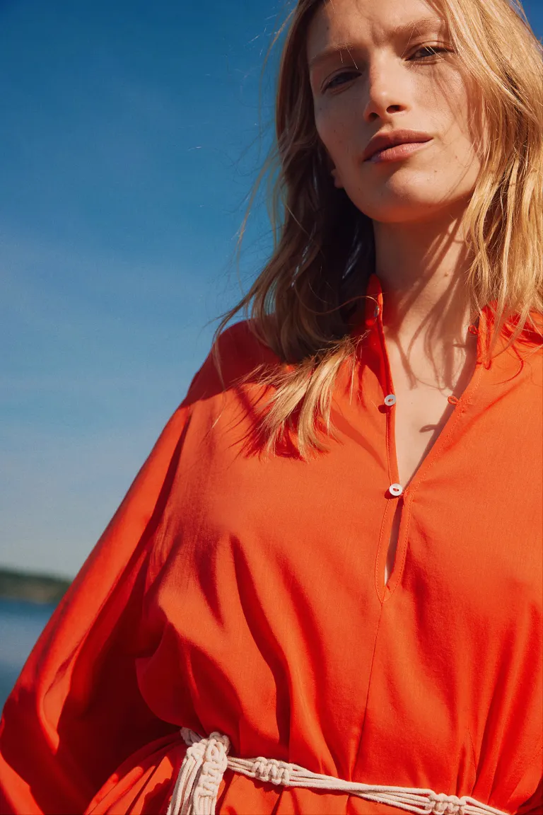 Бренд: H&M Цвет: красный Новинка Короткое платье из смеси хлопка и вискозы свободного кроя. Воротник стойка, короткая планка на пуговицах и съемный пояс макраме. Вырез на плечах, длинные рукава-фонарики с узкой окантовкой с разрезом и пуговицей по низу. Без подкладки. Размер: Рукав: Длина: 60,0 см (размер M), Плечо: Ширина: 49,0 см (размер M), Спина: Длина: 88,5 см (размер M) Длина: Короткая Длина рукава : Длинный рукав Посадка: Свободный крой Вырез: V-образный Фильм рукава: Рукав-воздушный шар