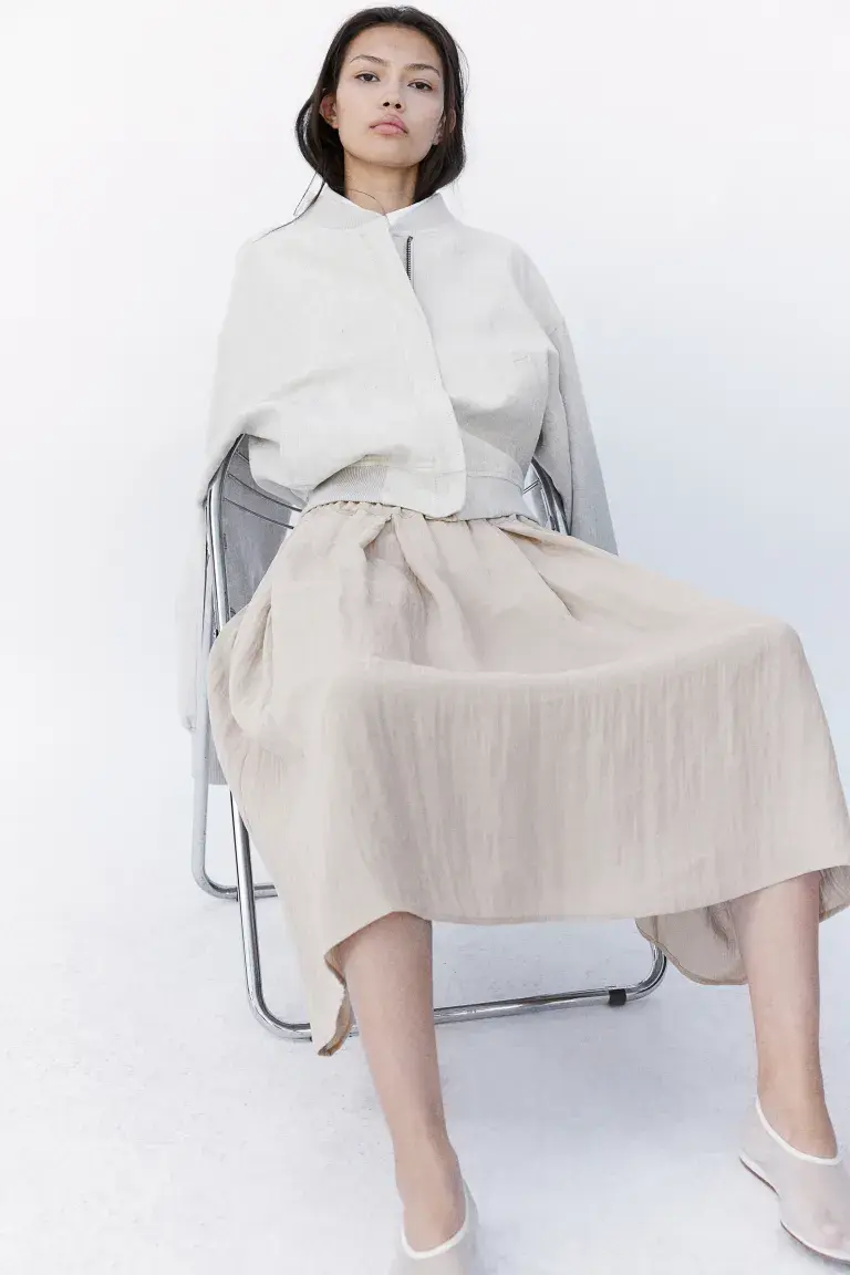 Бренд: H&M Цвет: бежевый Новинка Юбка длиной до икры из тканого материала свободного кроя со складками, создающими эффект А-силуэта. Высокий эластичный пояс и изящные боковые карманы. Размер модели: Рост модели 175 см/5 футов 9 дюймов, на ней размер S. Размер: Сзади: Длина: 77,5 см (размер M) Длина: Миди Высота талии: Высокая талия Посадка: Свободный крой Стиль: А-силуэт