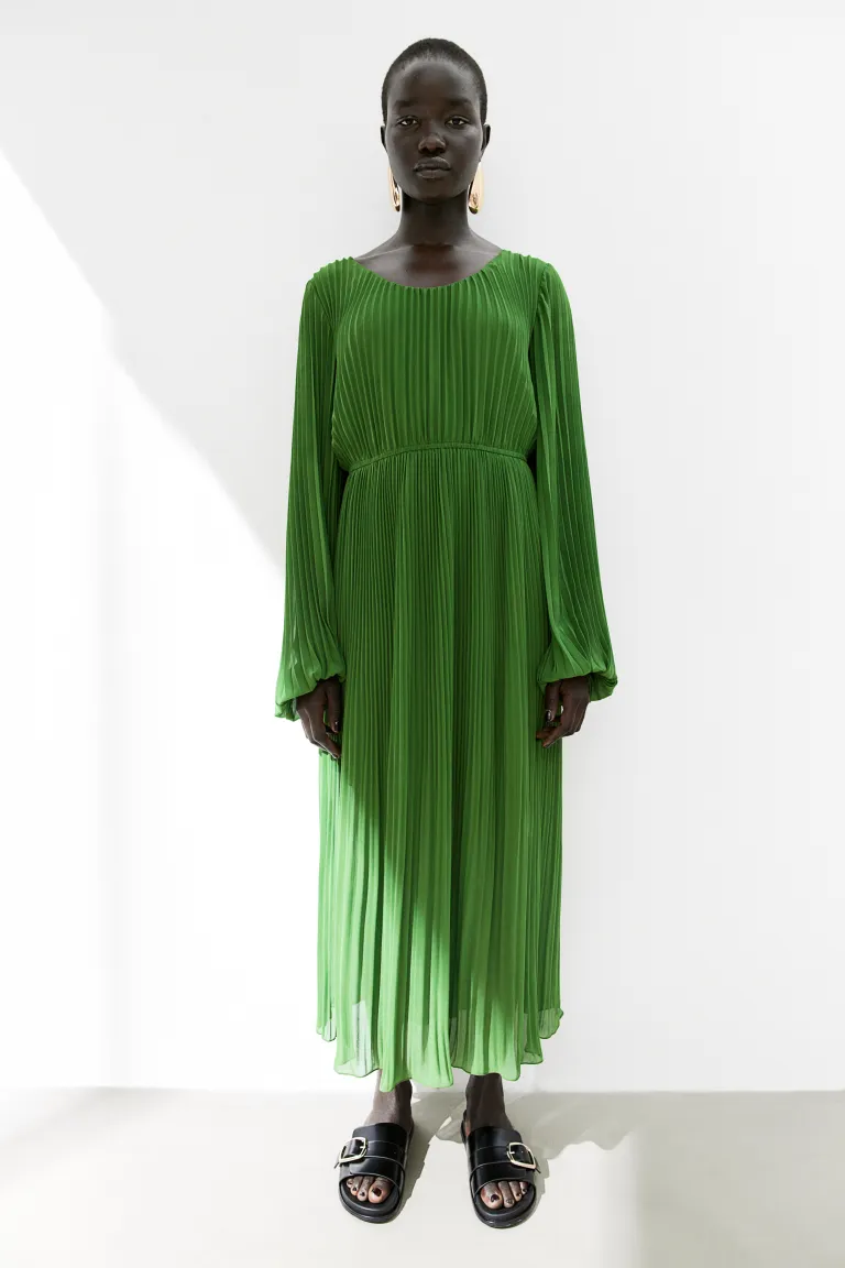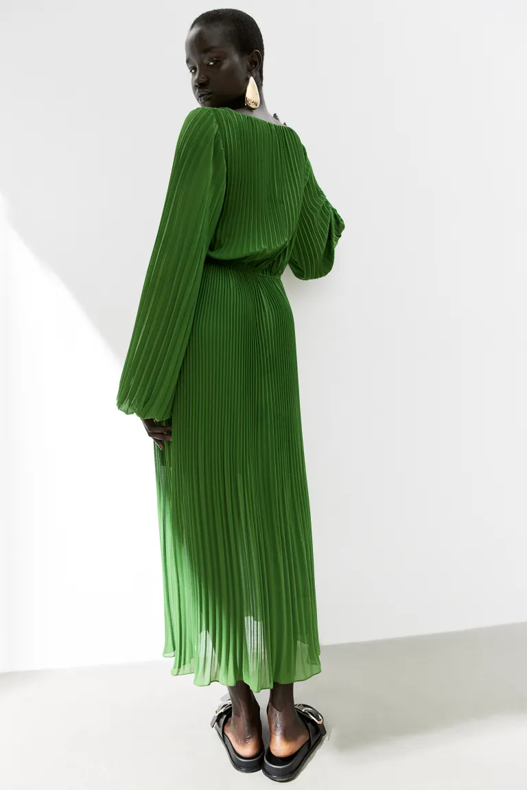 Бренд: H&M Цвет: зеленый Платье длиной до икры из плиссированного шифона с овальным вырезом и длинными рукавами-фонариками с эластичными манжетами. Узкая талия на резинке и слегка расклешенная юбка. Частичная подкладка. Размер модели: рост модели 175 см/5 футов 9 дюймов, размер S. Размер: спинка: длина: 128,0 см (размер M), рукав: длина: 69,5 см (размер M). ) , Плечо: Ширина: 36,5 см (размер M) Длина: Миди Длина рукава: Длинный рукав Посадка: Классический крой Стиль: Расклешенный Вырез: Глубокий вырез Рукав стиль: рукава-воздушные шары
