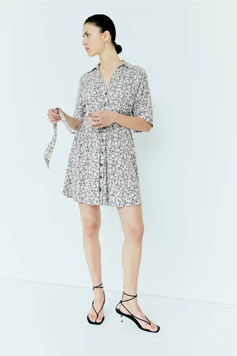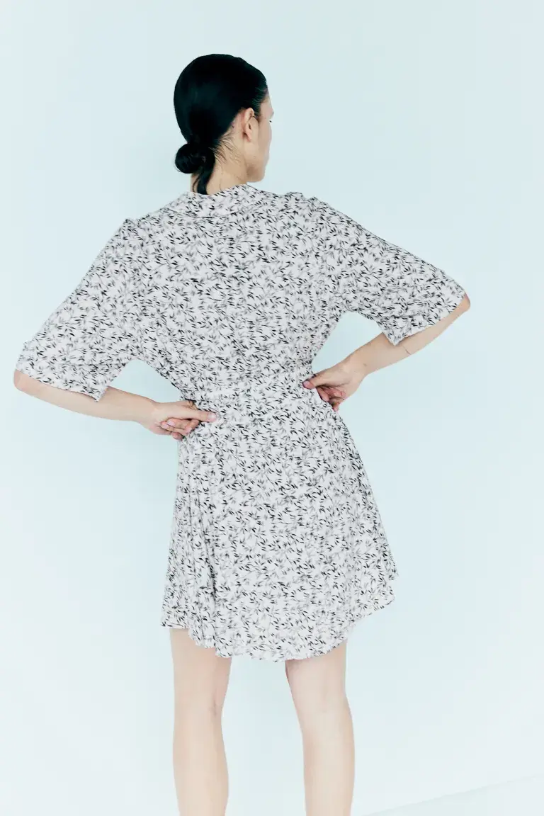Бренд: H&M Цвет: белый Новинка Короткое платье из тканого материала с воротником, V-образным вырезом и пуговицами спереди. Рукава реглан длиной до локтя, открытые нагрудные карманы и широкий съемный пояс на талии. Без подкладки. Размер: Спина: Длина: 90,0 см (размер M) Длина: Короткая Длина рукава: Короткий рукав Посадка: Обычная посадка Воротник: Открытый воротник Стиль: Платье-блузка Вырез: V-образный Фонировка рукавов: рукава реглан