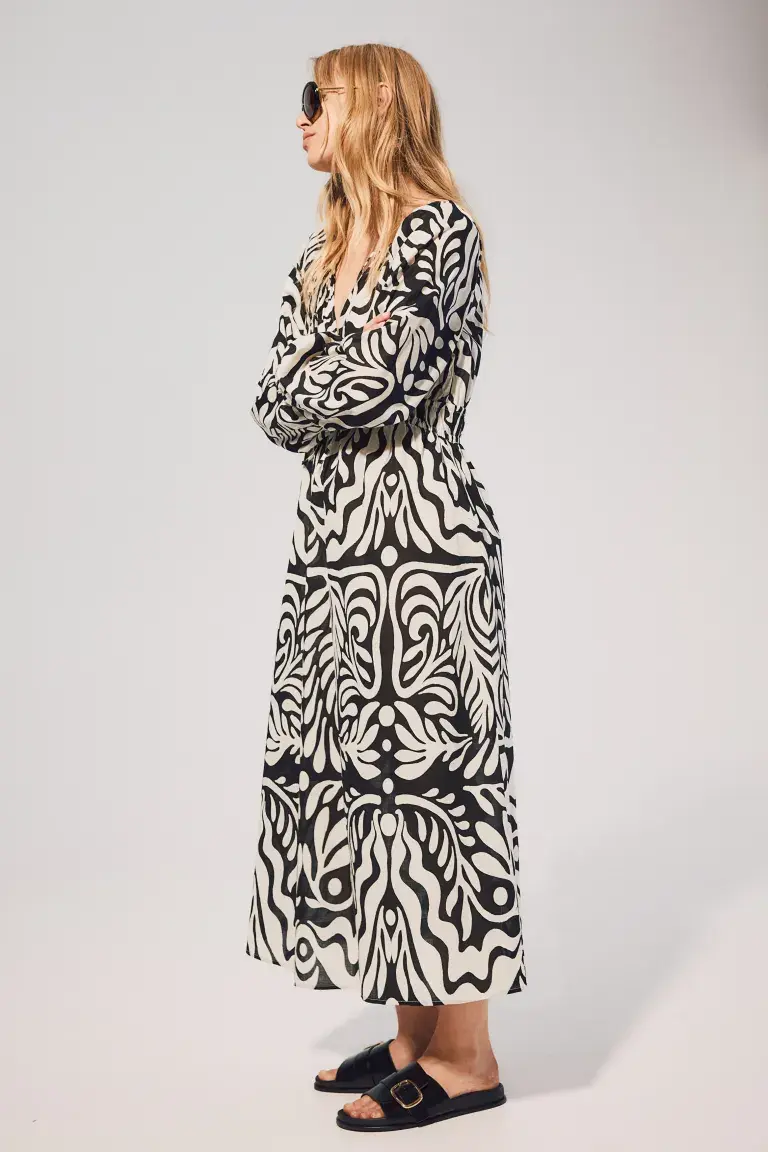 Бренд: H&M Цвет: черный Новинка Платье свободного кроя длиной до икры из воздушного хлопка с кулиской и V-образным вырезом спереди. Длинные рукава-фонарики кроя реглан со потайной резинкой на манжетах. Две вставки на узкой резинке на талии. Без подкладки. Размер модели: рост модели 175 см/5 футов 9 дюймов, размер M. Размер: Рукав: Длина: 70,0 см (размер M), спинка: Длина: 126,0 см (размер M). Длина: Миди Длина рукава: Длинный рукав Посадка: Свободный крой Фильм: Расклешенный, Капюшон Вырез: V-образный Фильм рукава: Рукав-баллон