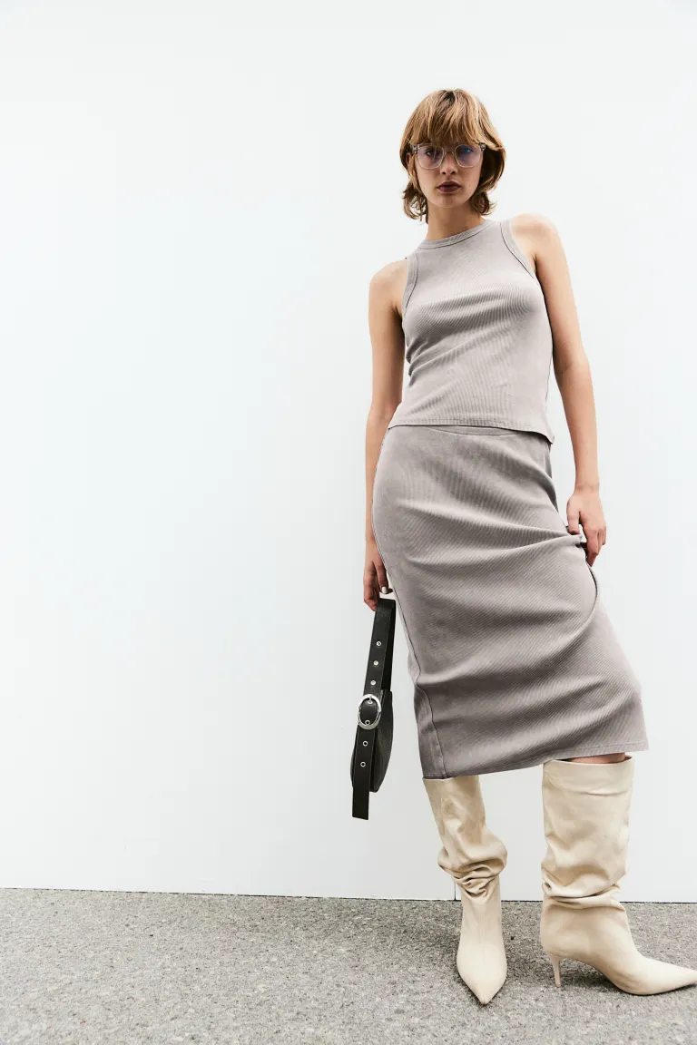 Бренд: H&M Цвет: серый Новинка Юбка длиной до икры, облегающая фигуру, из трикотажа в рубчик, с эластичным поясом и прямым низом с высоким разрезом сзади. Размер модели: рост модели 178 см/5 футов 10 дюймов, одета размер S. Размер: Спина: Длина: 79,0 см (Размер M) Длина: Миди Высота талии: Нормальная высота талии Посадка: Slim Fit Фильм: Юбка-карандаш, разрез Концепция: РАЗДЕЛЕННАЯ