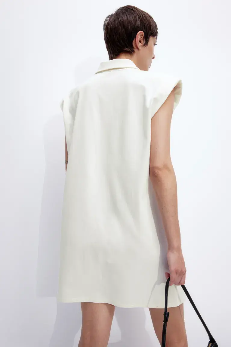 Бренд: H&M Цвет: бежевый Новинка Платье без рукавов из мягкого хлопкового трикотажа с двухслойным воротником, короткой планкой на пуговицах, подплечниками и прямым низом. Рост модели: Рост модели 177 см, размер M. . Размер: Плечо: Ширина: 45,5 см (размер M), Спина: Длина: 83,5 см (размер M) Длина: Короткая Длина рукава: Без рукавов Посадка: Приталенный Воротник: Отложной Стиль: платье-блузка Концепция: РАЗДЕЛЕННАЯ