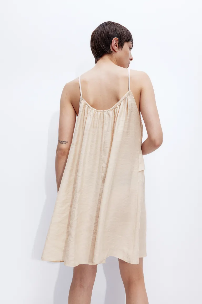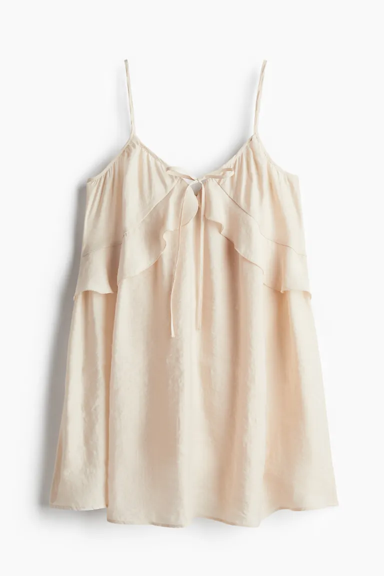 Бренд: H&M Цвет: бежевый Короткое платье свободного кроя из модальной смесовой ткани на тонких бретельках и глубоким круглым вырезом на узких завязках. Воланы ниже груди и прямой подол. Без подкладки. Рост модели: рост модели 177 см/5 футов 10 дюймов, на ней размер S. Длина: короткая Длина рукава: Без рукавов Посадка: Свободный крой Стиль: Расклешенное платье, Платье на узких бретелях, завязки спереди Вырез: глубокий вырез, круглый вырез Концепция: РАЗДЕЛЕННАЯ
