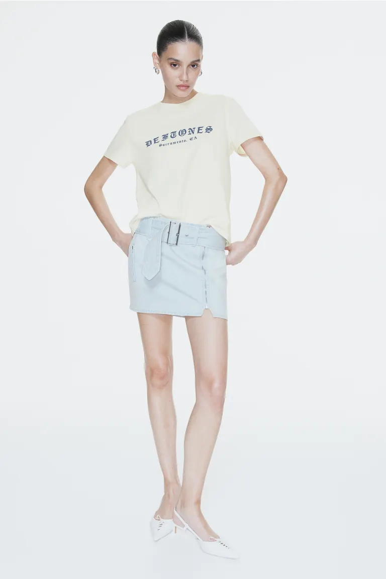 Футболка из мягкого хлопкового трикотажа с мотивным принтом спереди. Круглый вырез в рубчик, слегка заниженная линия плеча и прямой подол.