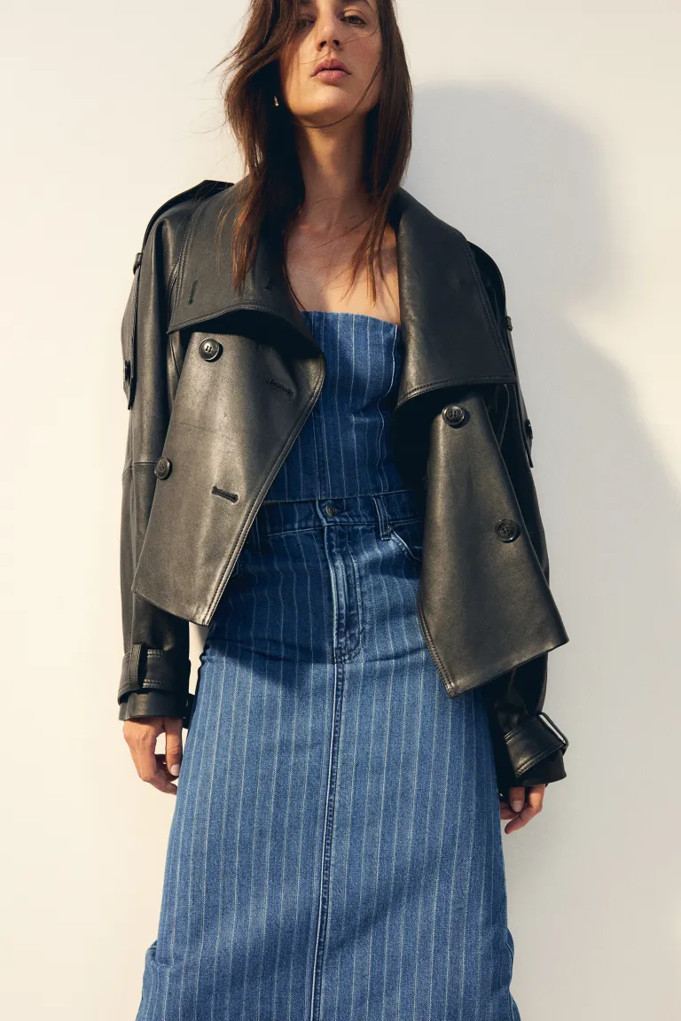 Короткий топ-бандо из хлопкового денима с видимыми швами, создающими нежный полосатый вид. Скрытая силиконовая отделка обеспечивает надежную посадку сверху. Застежка-молния сзади со потайной пуговицей.