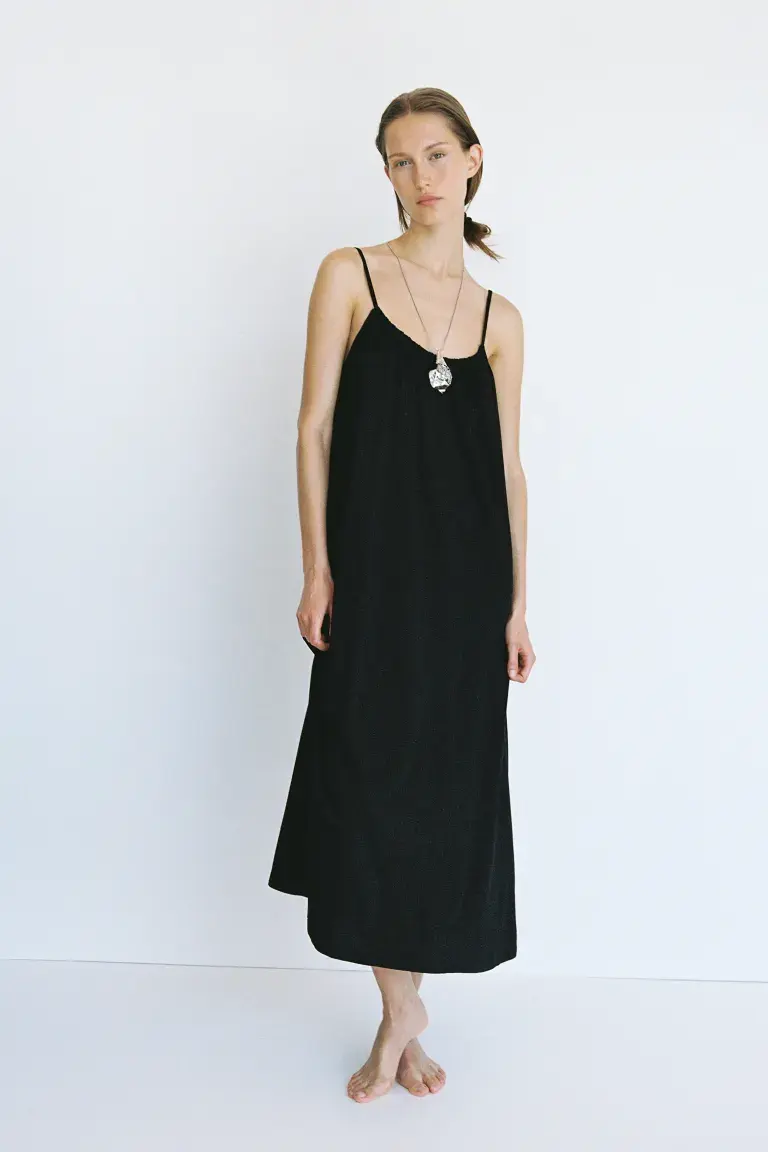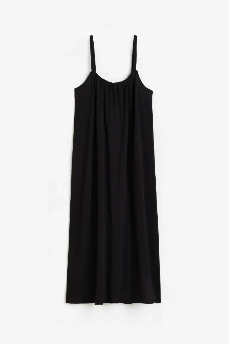 Платье из джерси оверсайз длиной до икры, с рюшами на вырезе, узкими бретелями и глубоким вырезом на спине.
