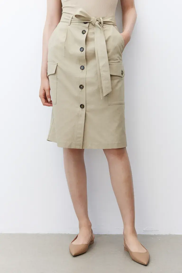 Бренд: H&M Цвет: бежевый Новинка Юбка из твила длиной до щиколотки, полностью застегнутая на пуговицы, со складками из смеси лиоцелла и хлопка. Высокий пояс со съемным поясом, косые боковые карманы и накладные карманы с клапанами на пуговицах по бокам. Без подкладки. Размер: Талия: Окружность: 79,5 см (размер 40), Спина: Длина: 61,0 см (размер 40) Длина: До колена Высота талии: Высокая талия Посадка: Обычная Посадка Стиль: карго, юбка-карандаш.