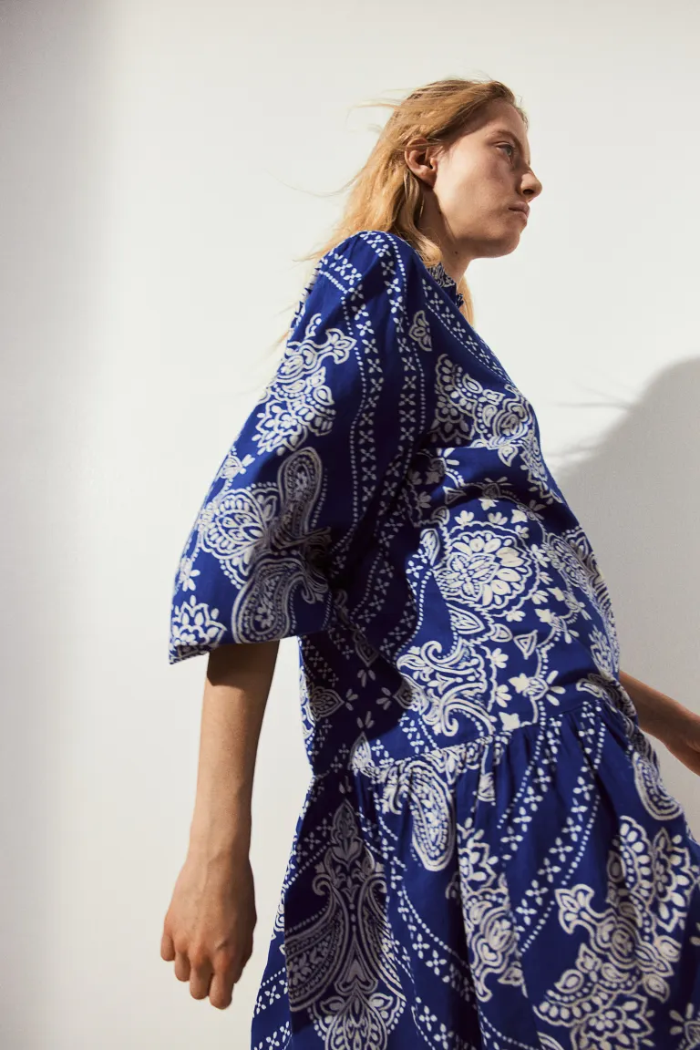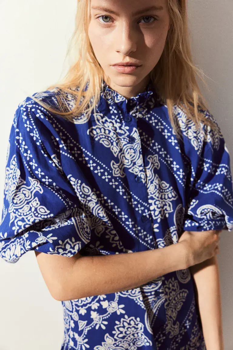 Бренд: H&M Цвет: синий Короткое тканевое платье с воланным воротником и длинной планкой на пуговицах. Слегка завышенные плечи, длинные рукава-фонарики с эластичными манжетами и заниженная юбка. Свободный крой. Размер: Спинка: Длина: 88,0 см (размер M), Рукав: Длина: 60,0 см (размер M), Плечо: Ширина: 44,0 см (размер M) Длина: Короткая Рукав длина: длинный рукав Посадка: свободный крой Воротник: волан, воротник-стойка Фильм рукава: рукав-баллон