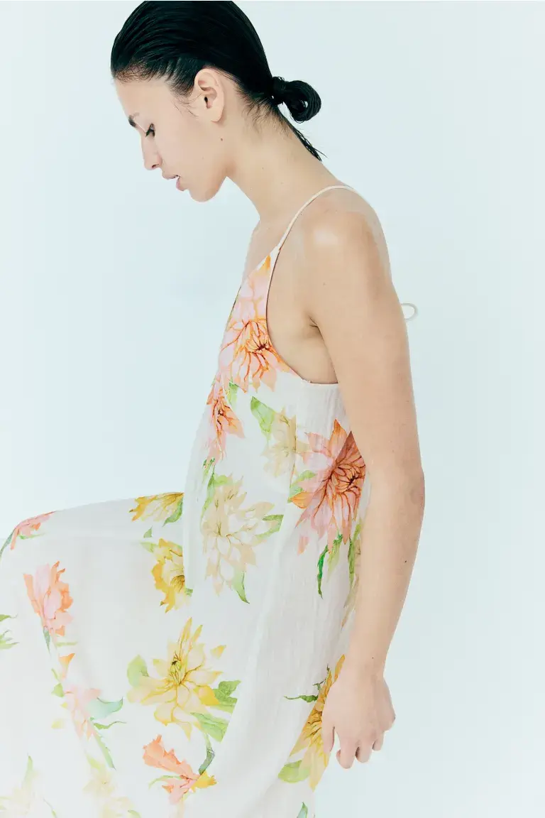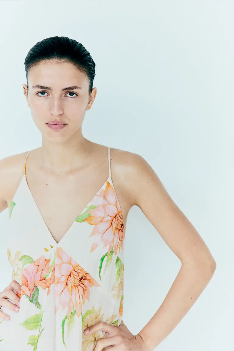 Бренд: H&M Цвет: белый Новинка Платье длиной до икры из воздушной ткани с V-образным вырезом и бретельками-спагетти, которые протягиваются через небольшие петельки и завязываются сзади. Диагональные швы под грудью и расклешенная юбка. На подкладке в области груди. Длина: Миди Длина рукава: Без рукавов Посадка: Обычная посадка Фильм: Расклешенная спина, низкая спинка, платье на узких бретелях Вырез: V-образный вырез